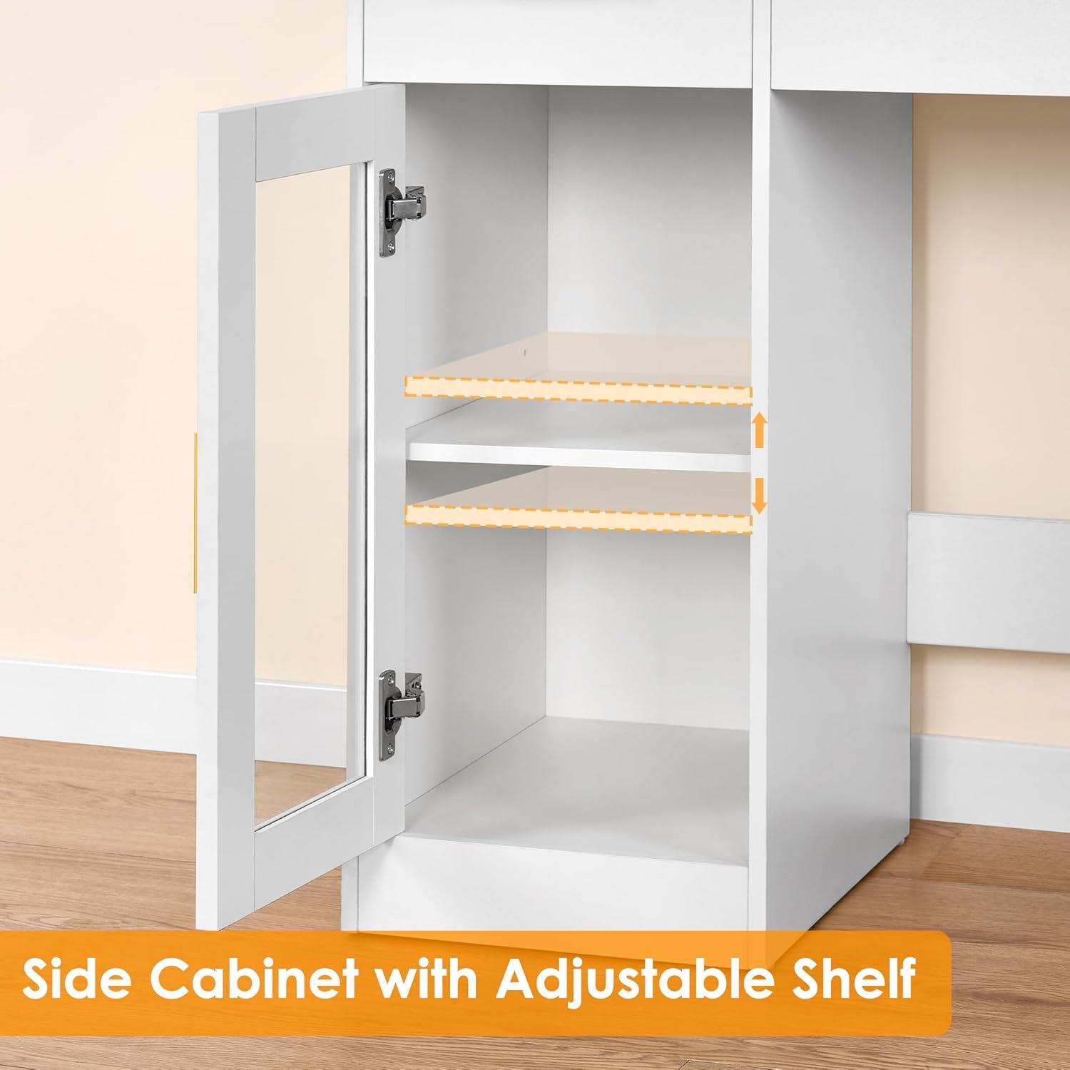 【POWERFUL STORAGE CAPACITY】The 49.2″ large makeup vanity offers ample storage capacity. Its spacious tabletop and glass cabinets provide sufficient space for your frequently used makeup items. The dressing table has 5 drawers and, which can easily accommodate all your belongings. The white vanity glass top drawer, not only allows for DIY drawer dividers but also enables you to quickly locate the makeup or jewelry you desire