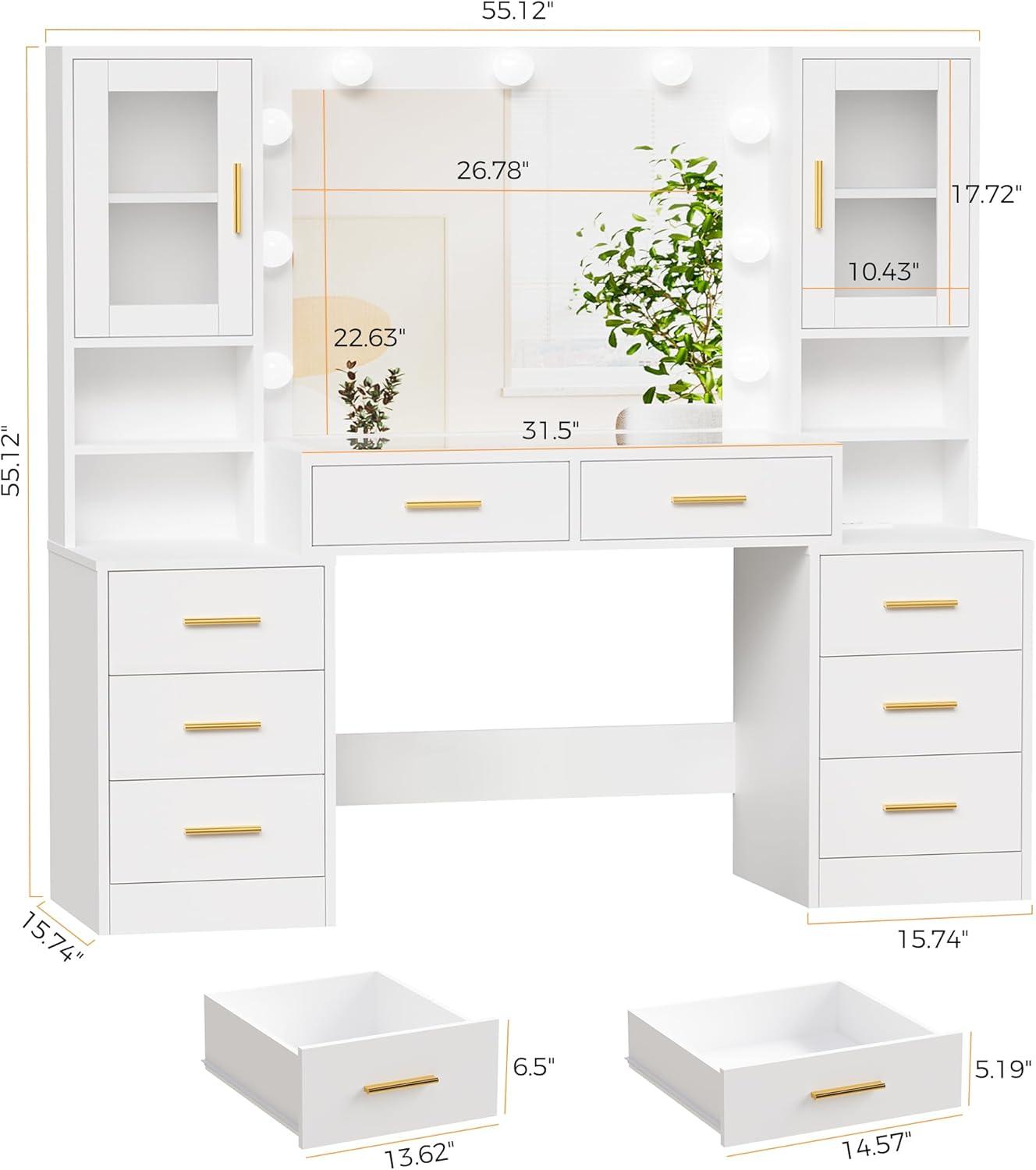 【VANITY WITH LIGHTS HOLLYWOOD BULBS】The vanity desk is equipped with 9 Hollywood-designed bulbs with 3 different color modes: cold light, warm light, natural light. You can press the button to adjust the lighting to 3 colors or brightness according to different scenes and makeup needs