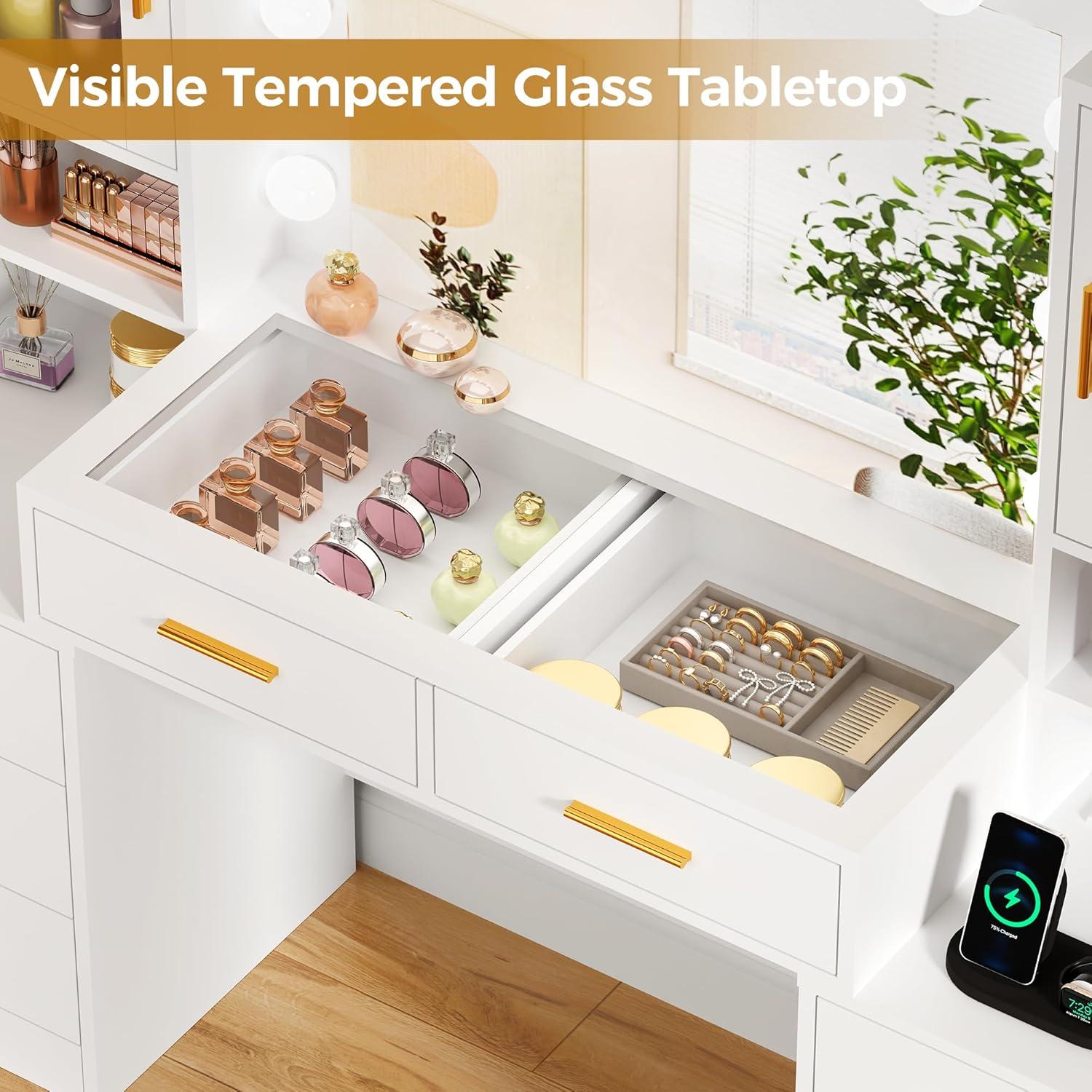 【LARGE VISUAL GLASS TABLETOP 】The white vanity with lights features a distinctive large glass table top of, allowing for a clear view of the beauty tools and items stored in the drawers, facilitate easy categorization and organization of cosmetics, ensuring the womens vanity remains tidy and orderly. This vanity with mirror and lights allows you to locate your favorite items at a glance