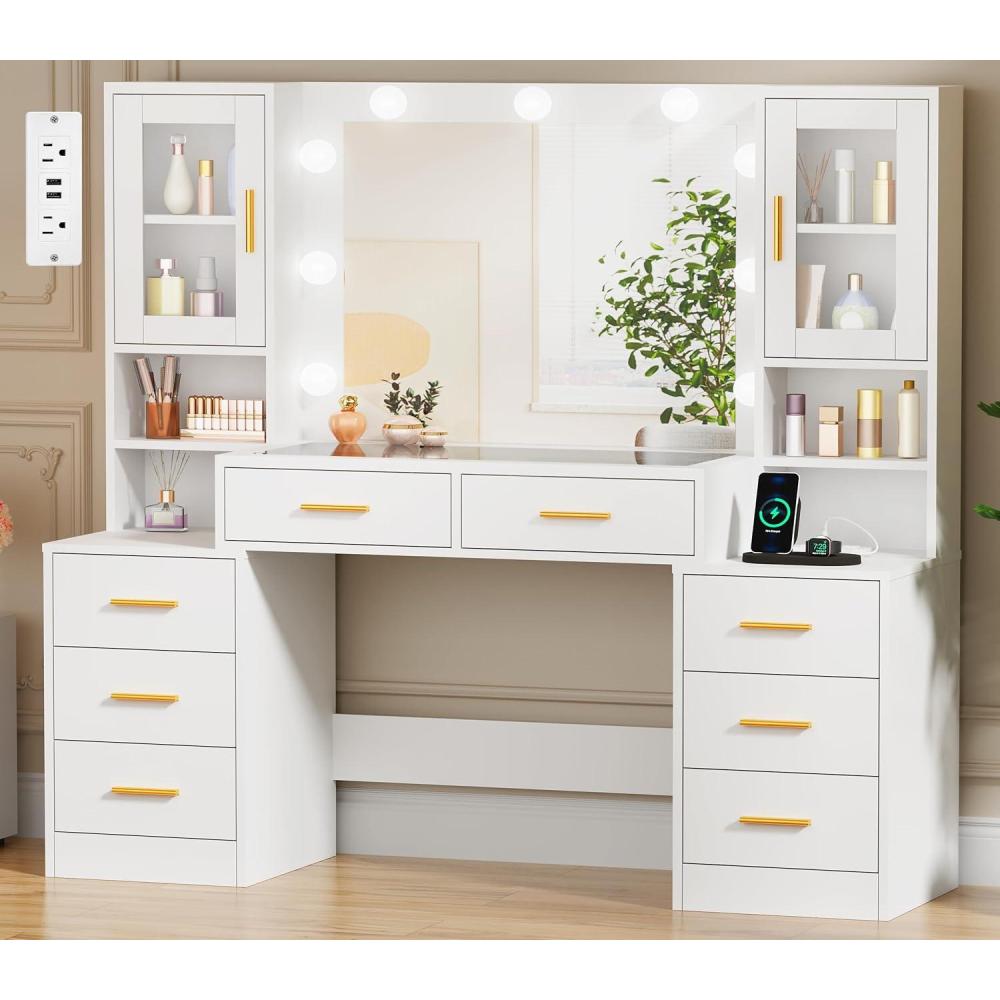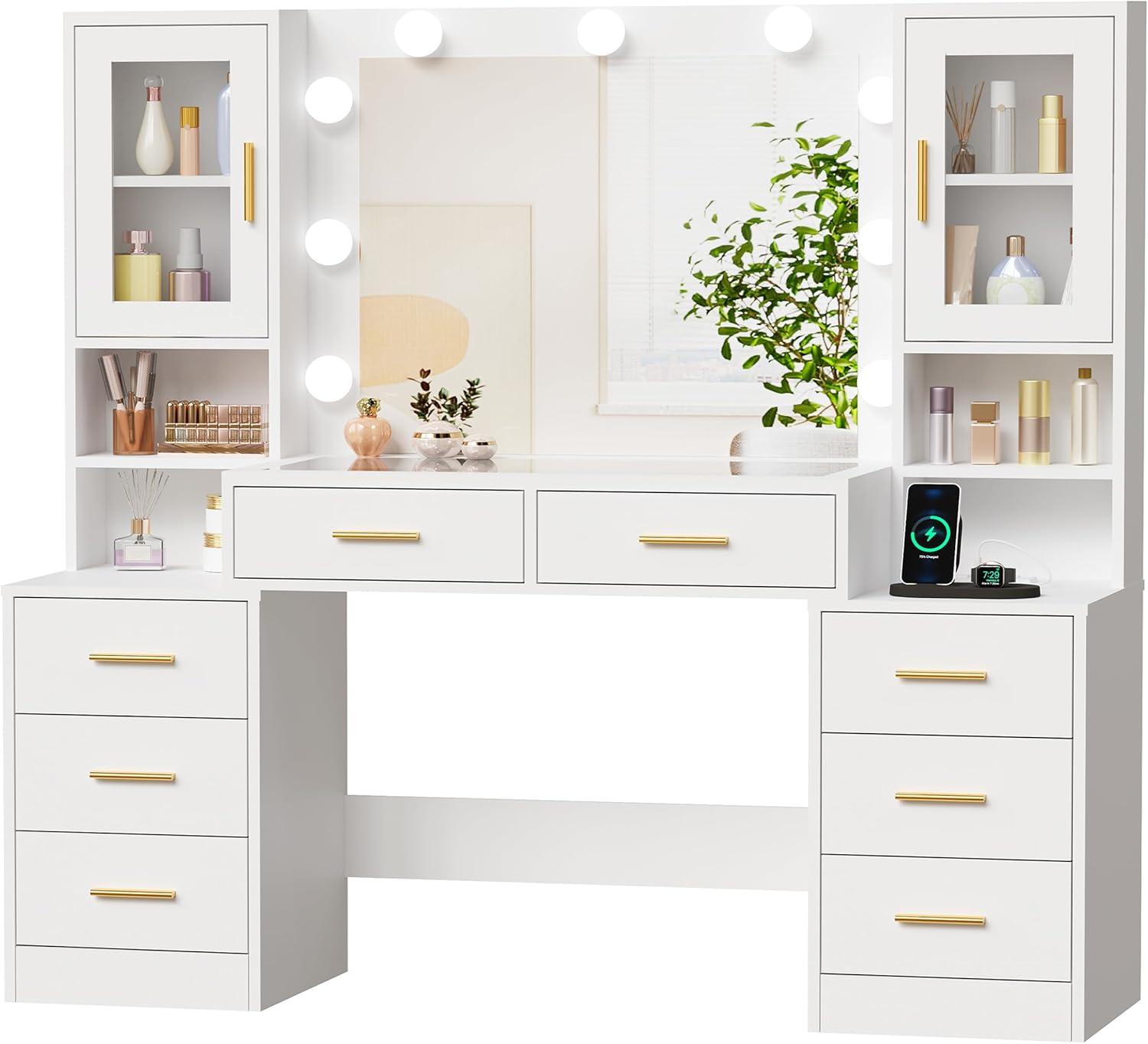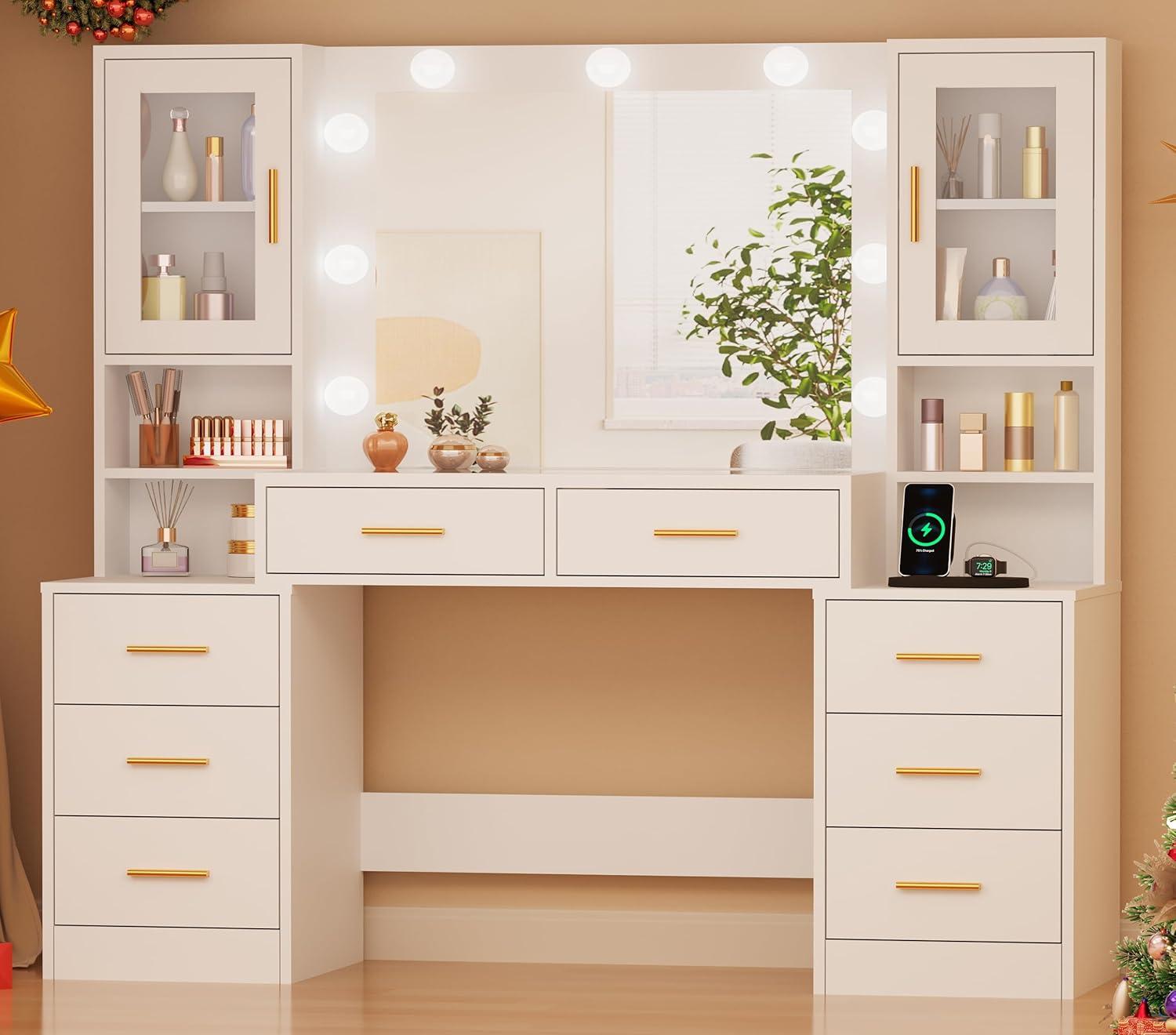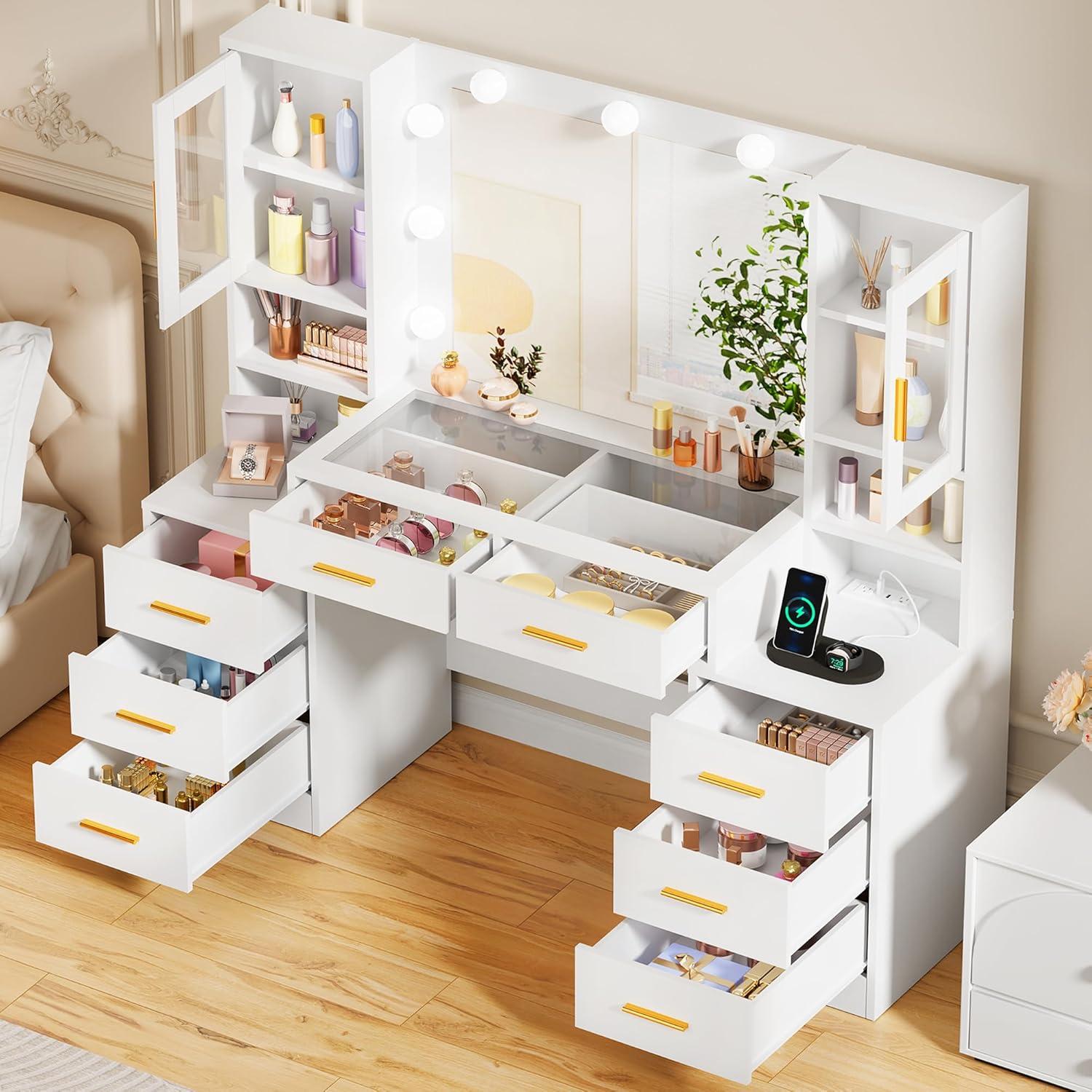 【POWERFUL STORAGE CAPACITY】This large makeup vanity table includes 8 drawers and 2 storage compartment with glass door, 4 open storage shelves and a glass tabletop. There are ample shelves and drawers to organize makeup, brushes, creams, perfumes and small accessories. Keeping your beauty essentials organized. Let you have a neat desktop from now on
