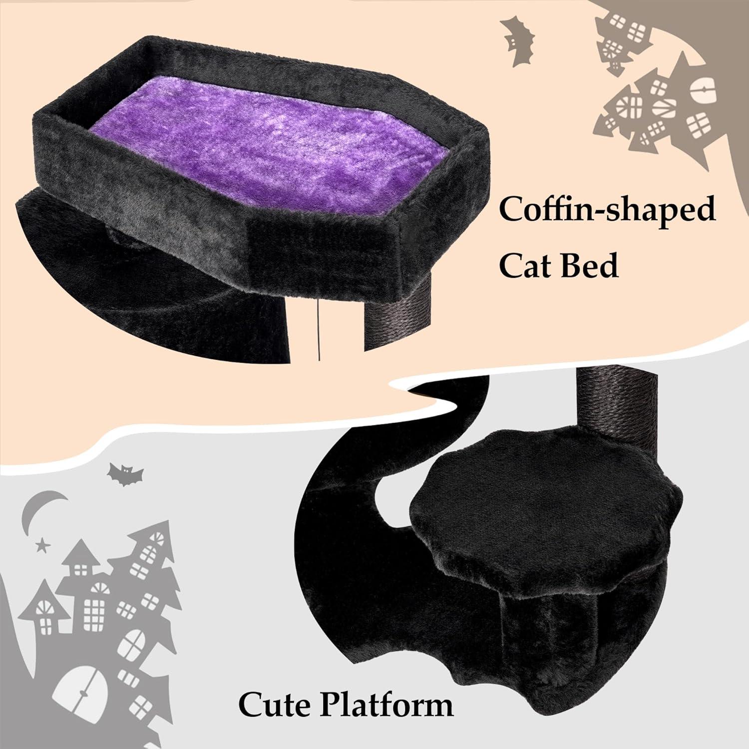 【Gothic Cat Tree】: This cat tree tower features a Gothic design with scratching post and coffin bed, spacious cat condo, bat-shaped base, spiders hanging toy, and a visually stunning red and black color scheme creating dark elegance and mystique, very suitable for your cat's daily play