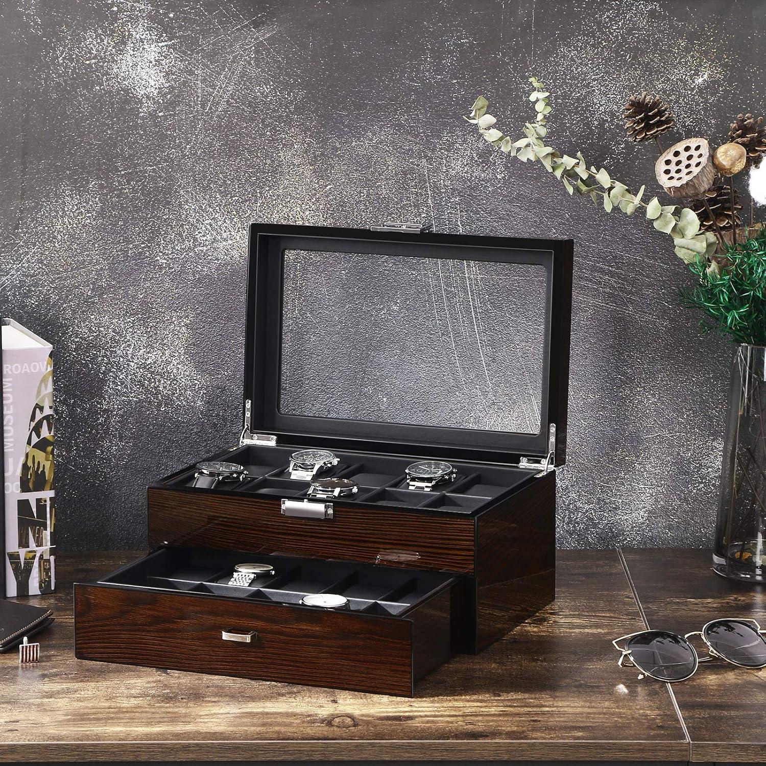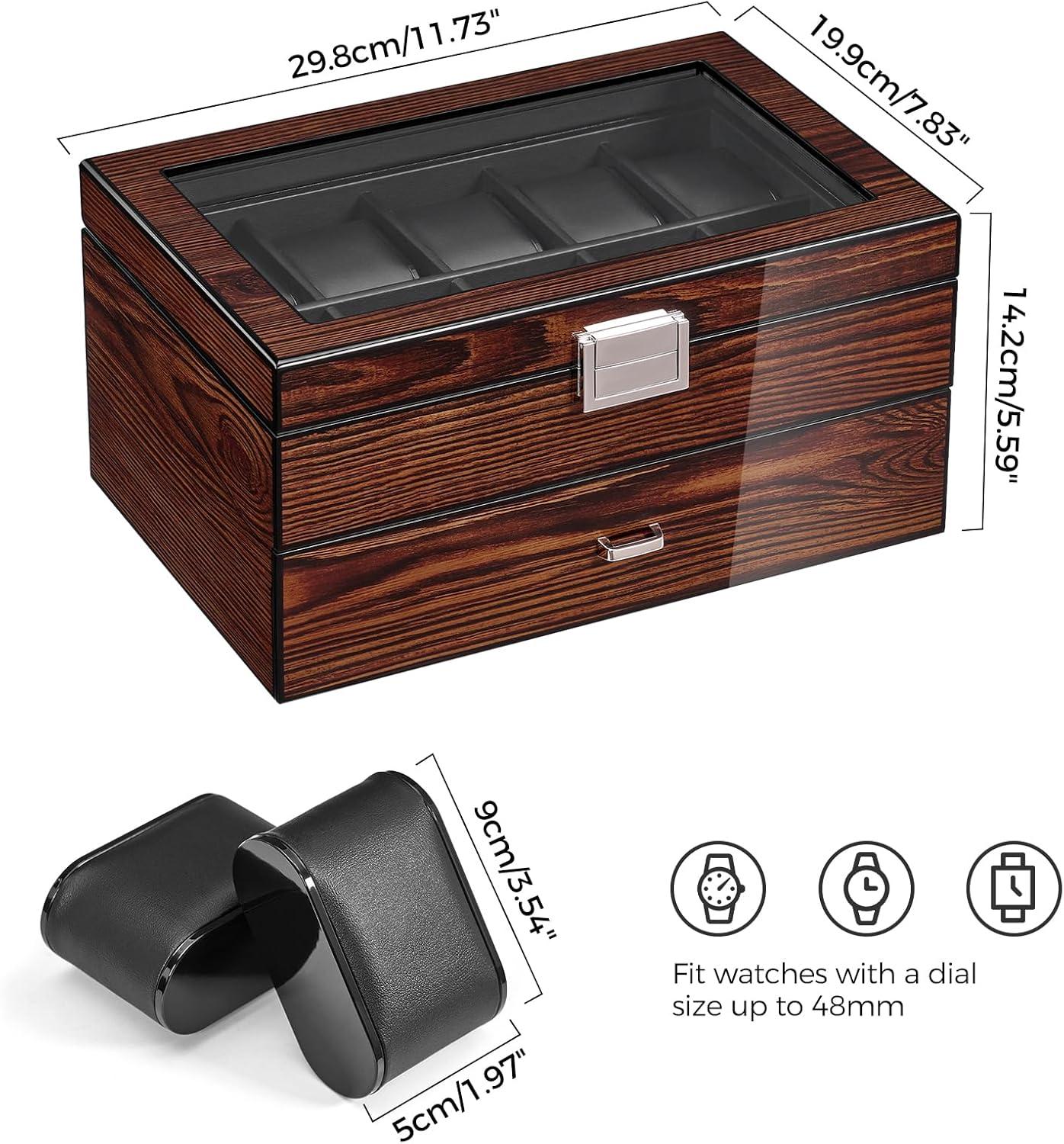 [Transparent Glass Lid]: This watch cases for men features a transparent glass lid design, allowing you to view all watches and quickly find the perfect watch for any occasion. If your watches are eco drives,light is able to go through and charge the watches to keep.