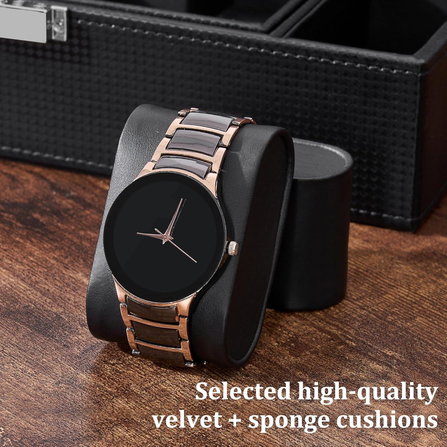 FUNCTIONAL DESIGN: Velvet lining protects your watch from scratch and damage. 4 watch pillows are removable for sparing more room for jewelry. You can insert rings, ear studs or cuff links side by side, which helps you easily find the matching pairs