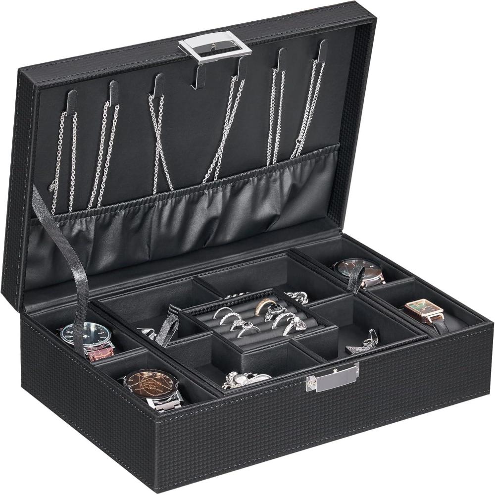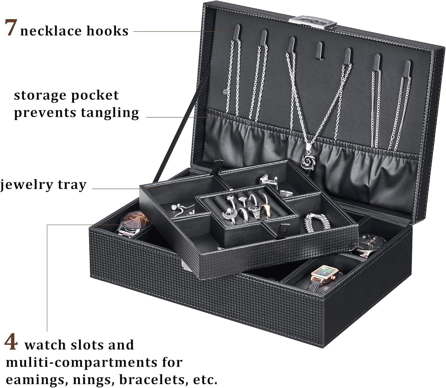 BEWISHOME Mens Jewelry Box Organizer, Jewelry Box for Men Women with 4 Watch Case Removable Tray, Jewelry Display Storage Case, Carbon Fiber Design Earring Ring Bracelet Case, Black SSH07C(Black)