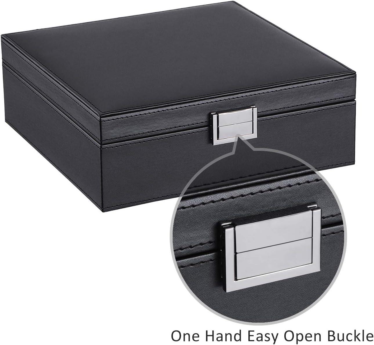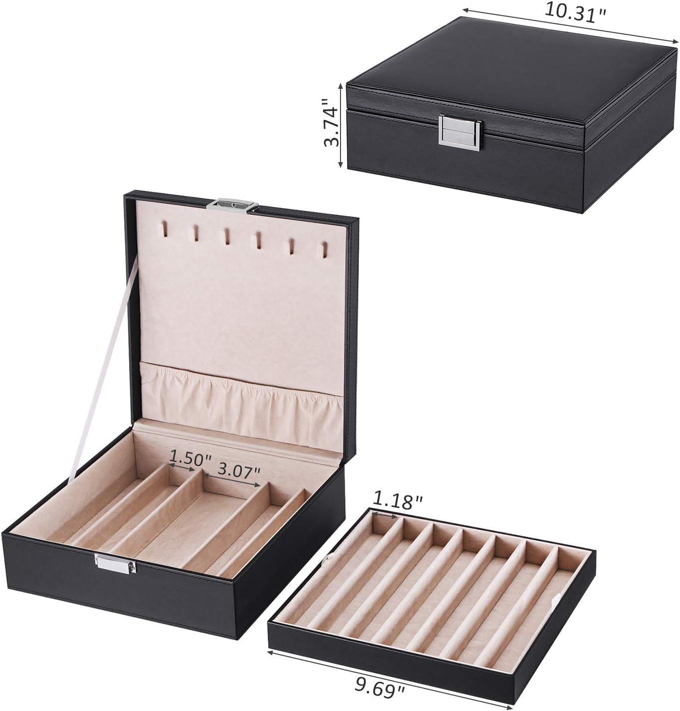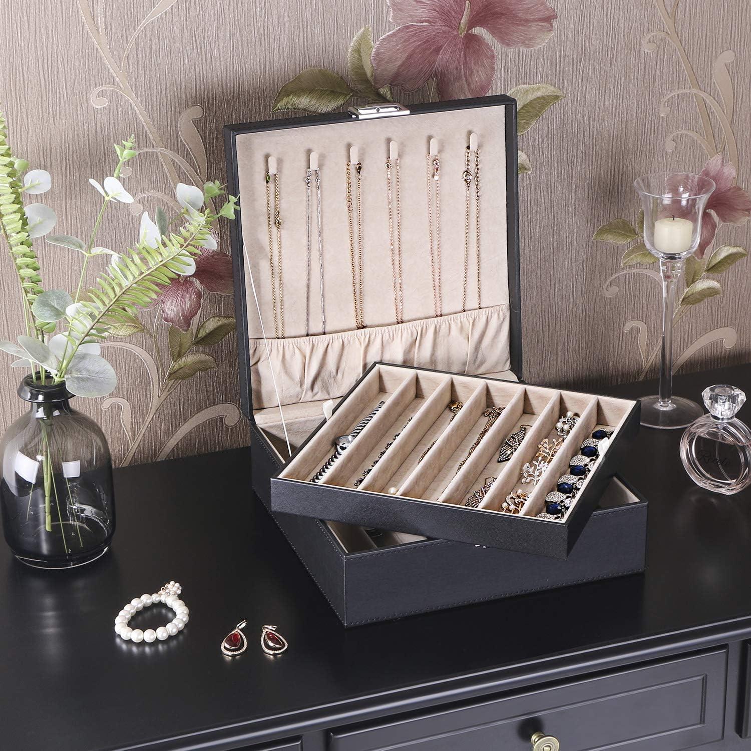 COMPACT DESIGN: 2-tray necklace organizer is space saving, and neatly holding your bands, chains, necklaces, bracelets and watches in one place. Overall dimension: 10.31 x 10.31 x 3.74 inches (LxWxH); it will look great on dresser and shelf without taking much space. The necklace storage box is convenient for daily use