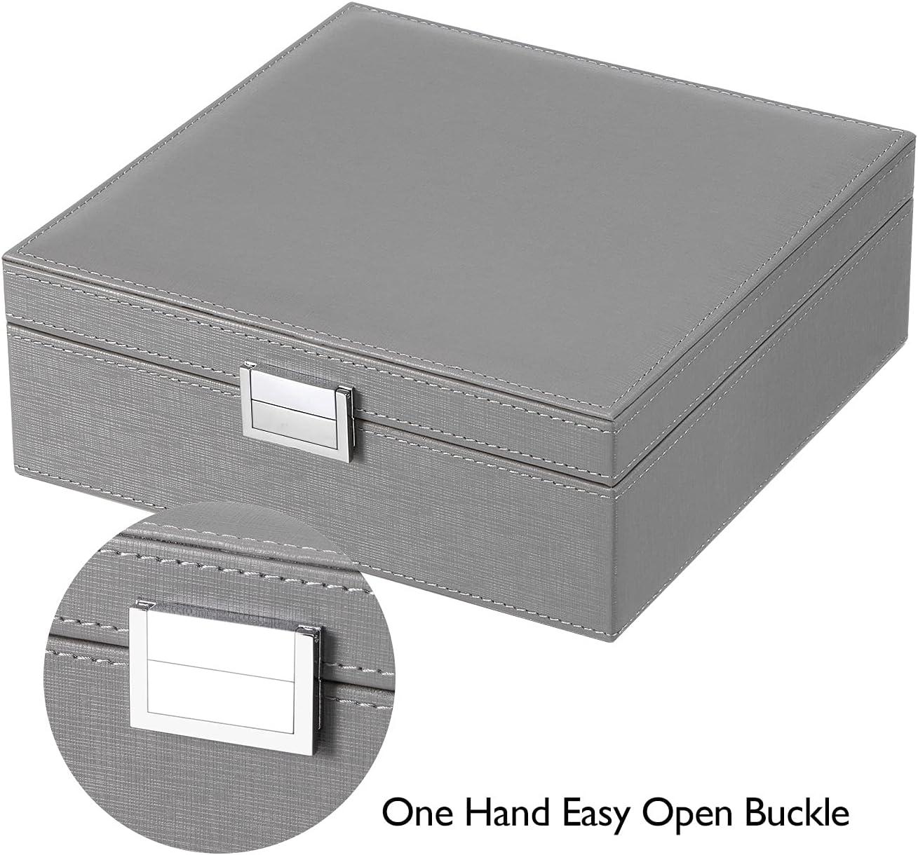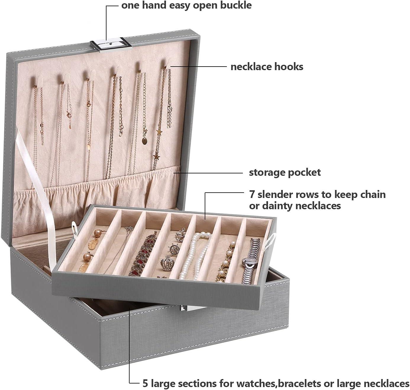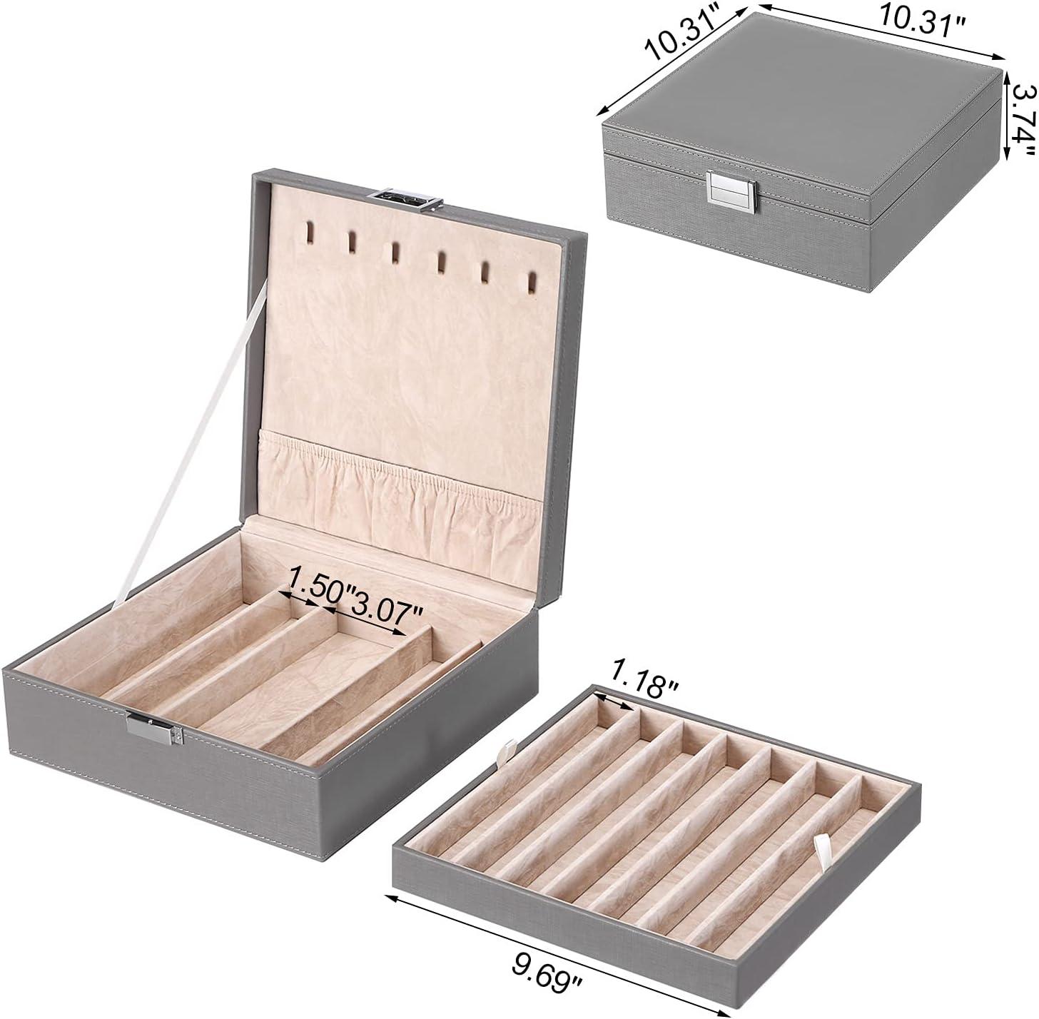 COMPACT DESIGN: 2-tray necklace organizer is space saving, and neatly holding your bands, chains, necklaces, bracelets and watches in one place. Overall dimension: 10.31 x 10.31 x 3.74 inches (LxWxH); it will look great on dresser and shelf without taking much space. The necklace storage box is convenient for daily use