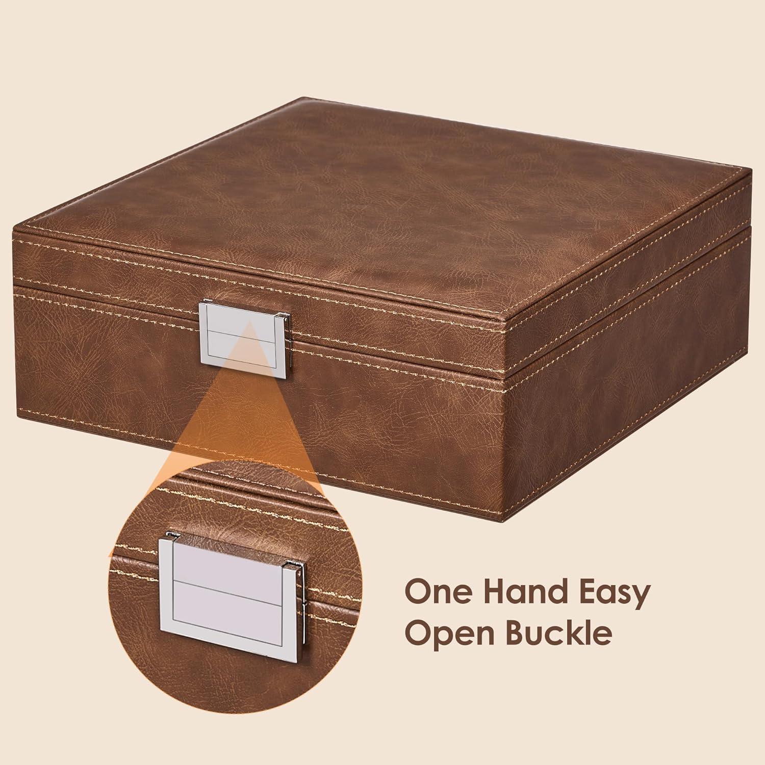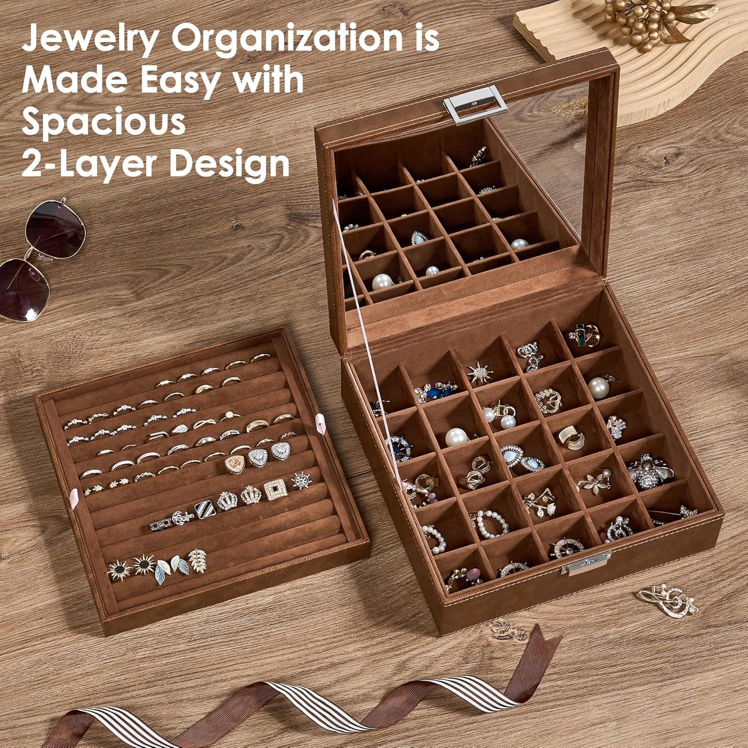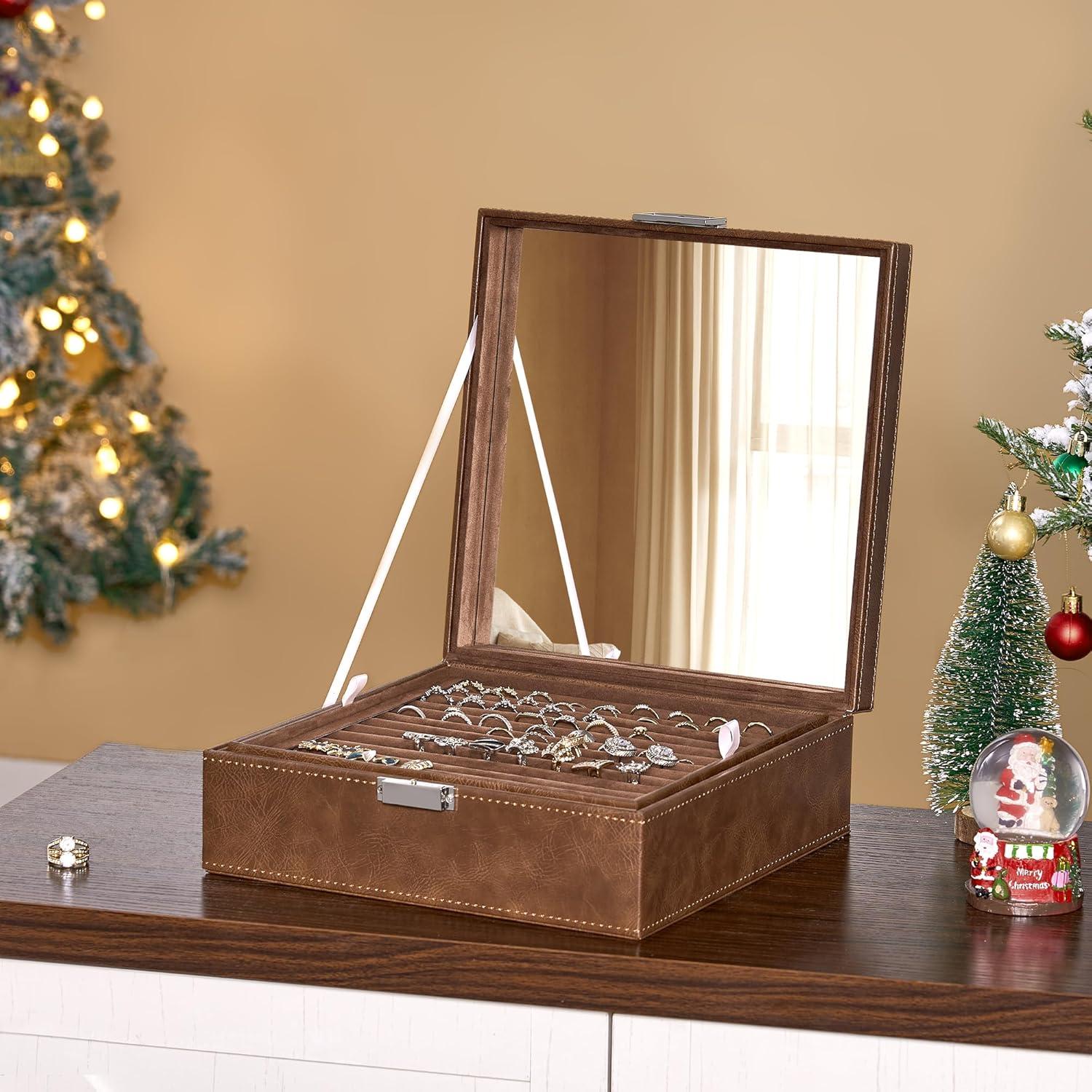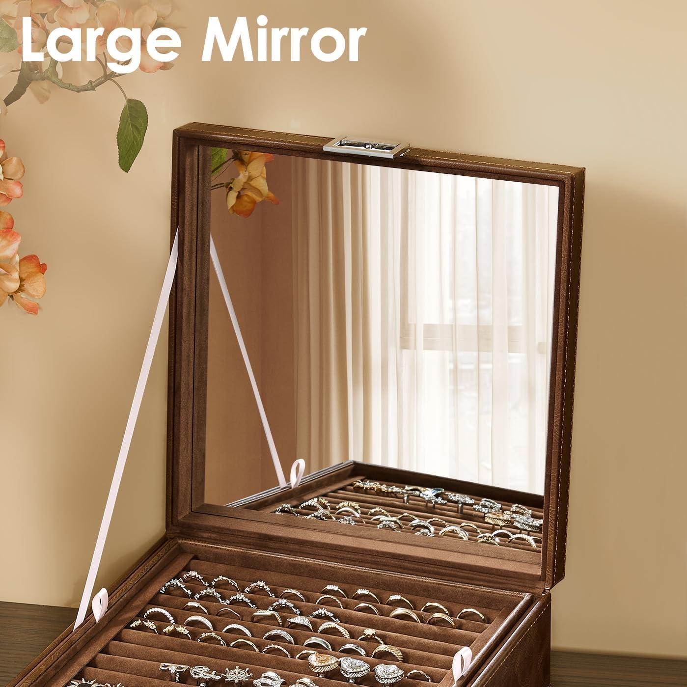 BEWISHOME Ring Organizer and Earring Box Holder - 11 Ring Slots, 25 Earring Compartments, Large Mirror, 2 Layers Jewelry Box Tray Cufflinks Storage for Girls Women Men, Black Faux Leather SSH21B(Brown)