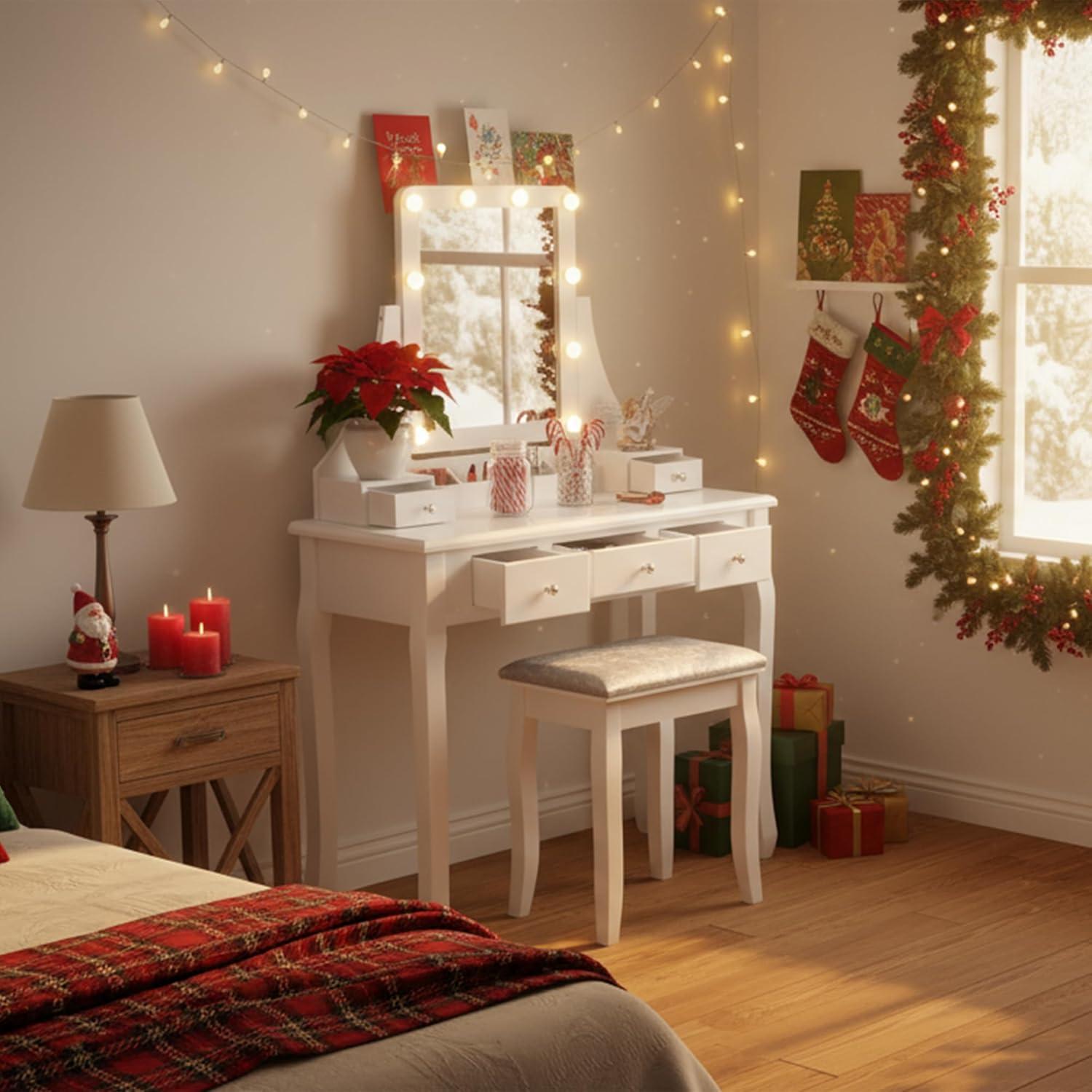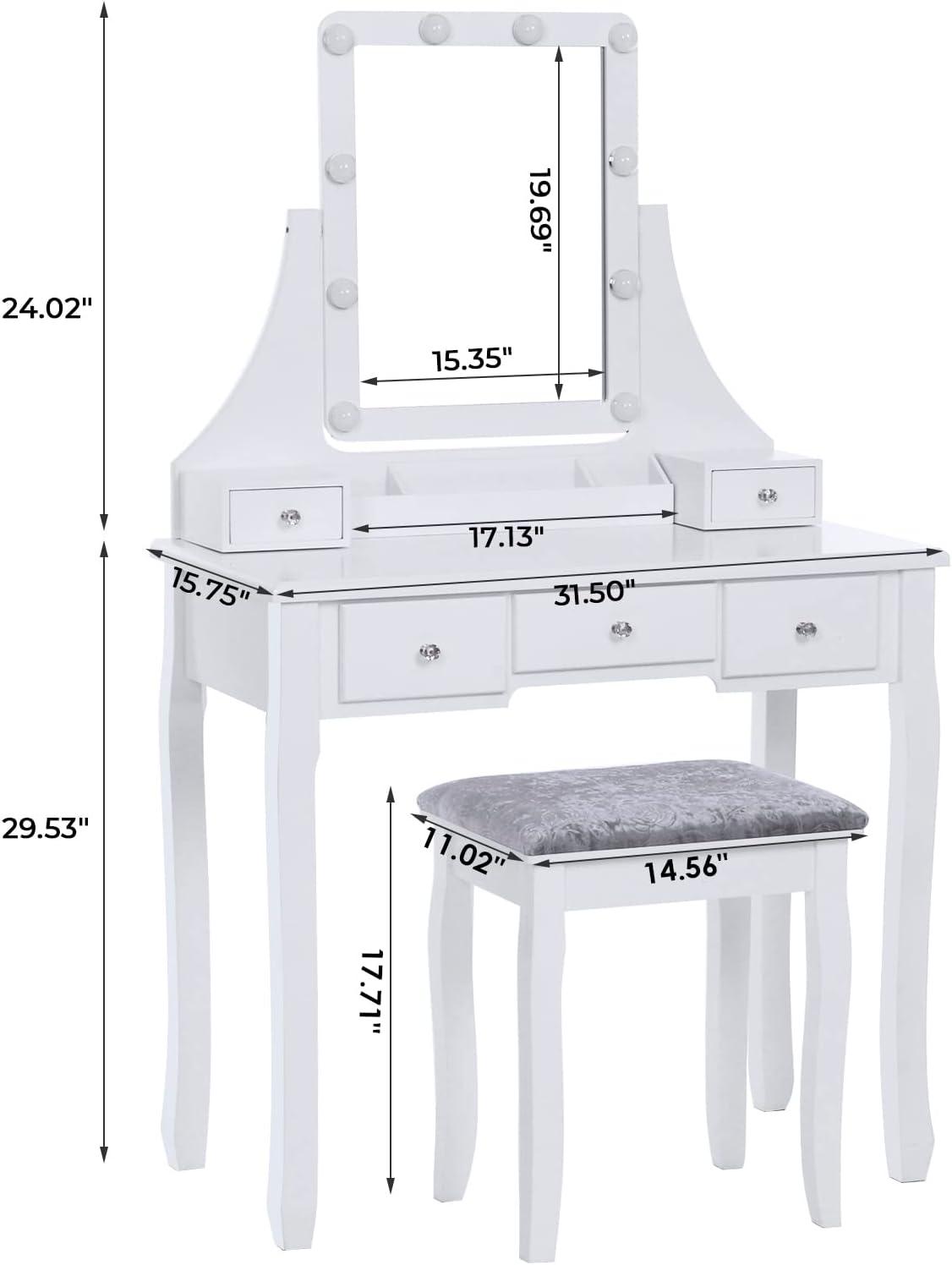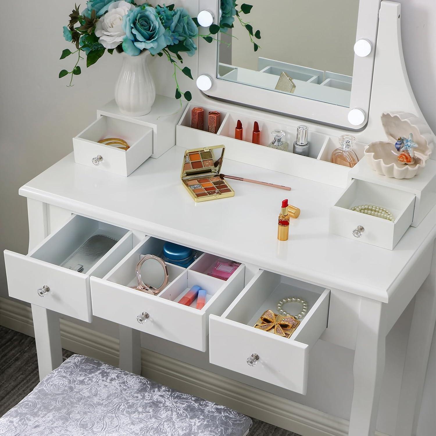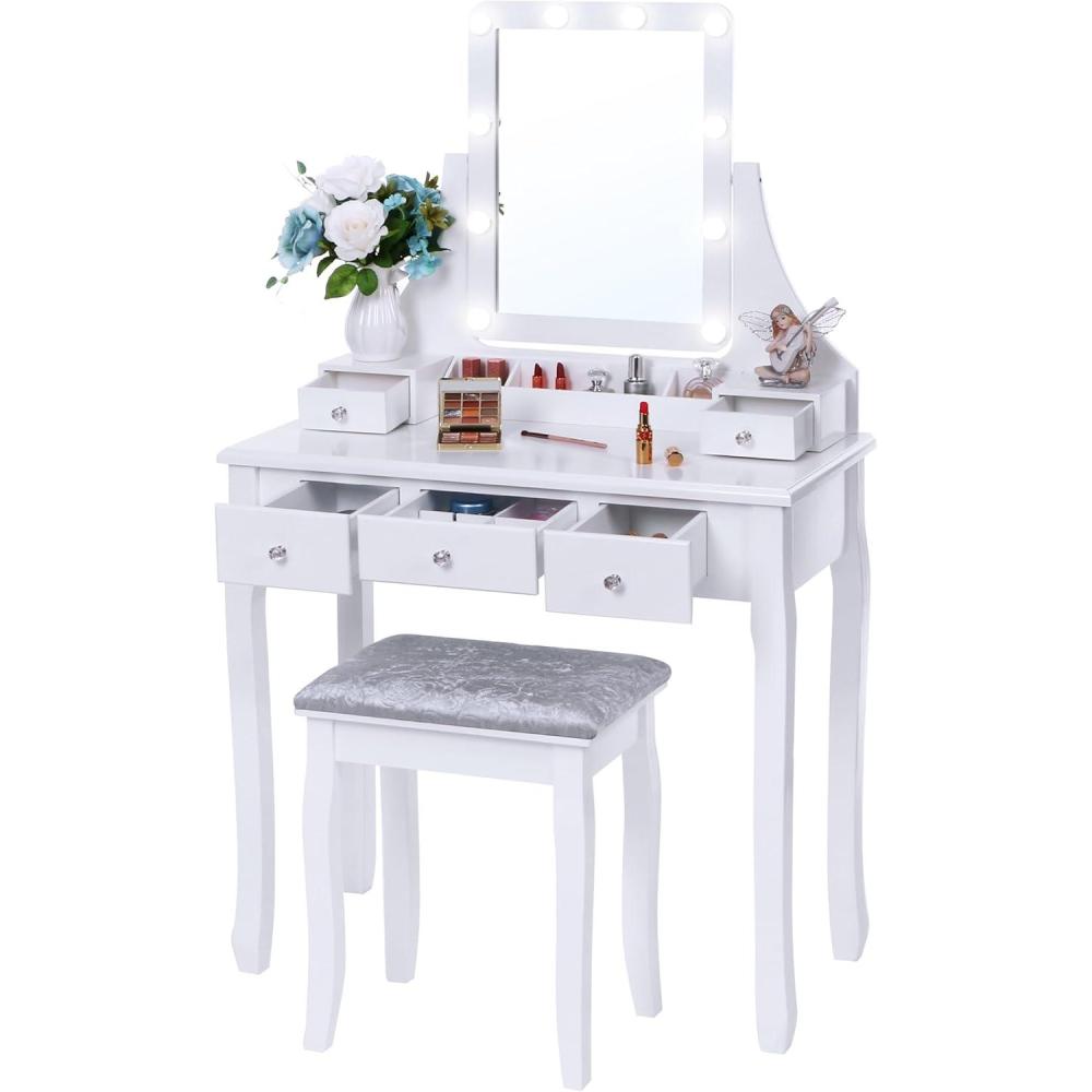 LIGHTED VANITY MIRROR: This vanity desk features a LED lighted vanity mirror with size and adjustable brightness. The 10 LED dimmable bulbs offer your beauty station sufficient and adjustable brightness. With the tilt functionality, it will help get an angle and make looking at yourself easy