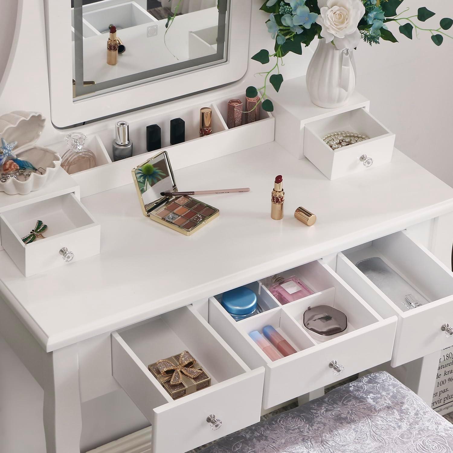 imageBEWISHOME Vanity Set with Mirror ampamp Cushioned Stool Dressing Table Vanity Makeup Table 5 Drawers 2 Dividers Movable Organizers White FST01Wlight strip