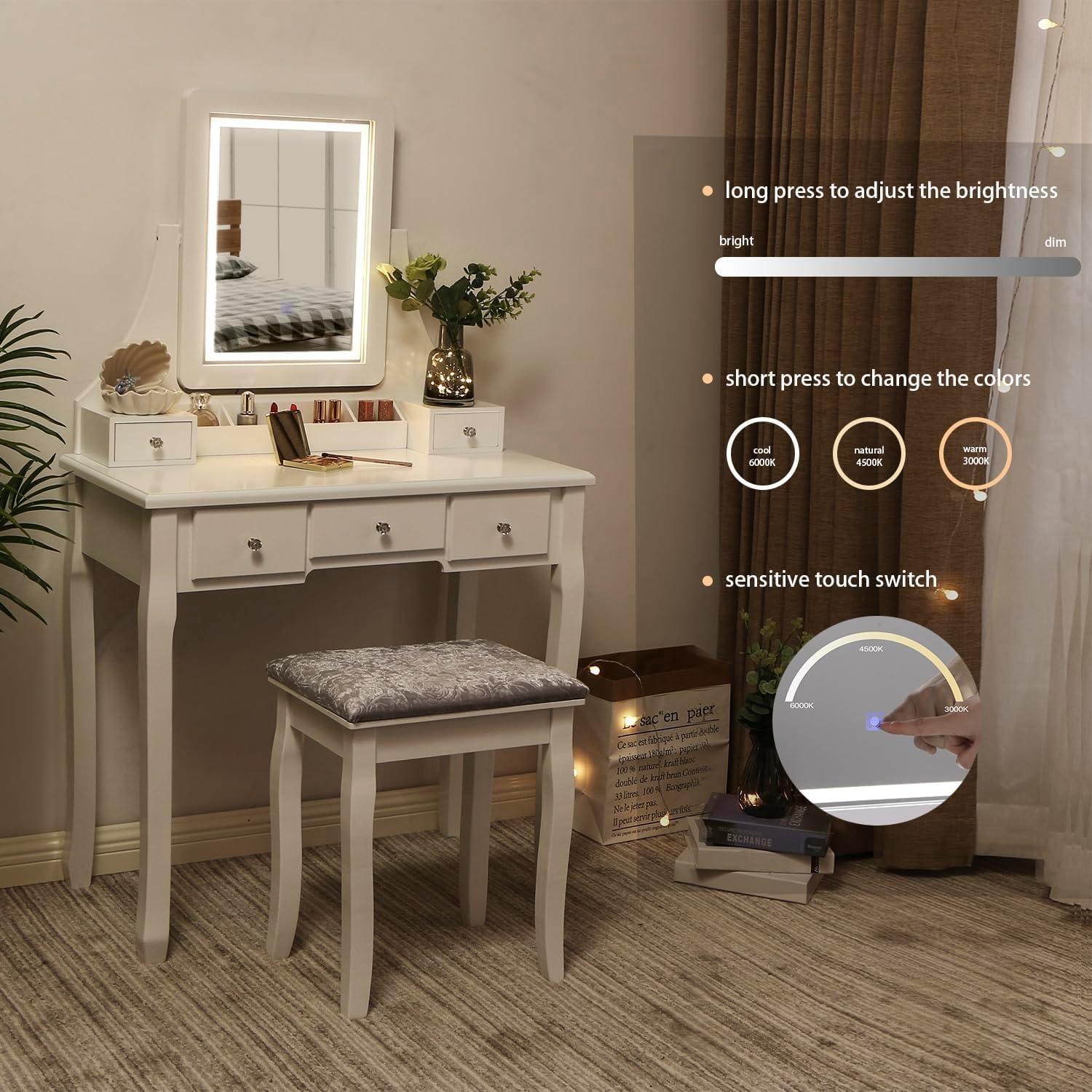 BEWISHOME Vanity Set with Mirror & Cushioned Stool Dressing Table Vanity Makeup Table 5 Drawers 2 Dividers Movable Organizers White FST01W(light strip)