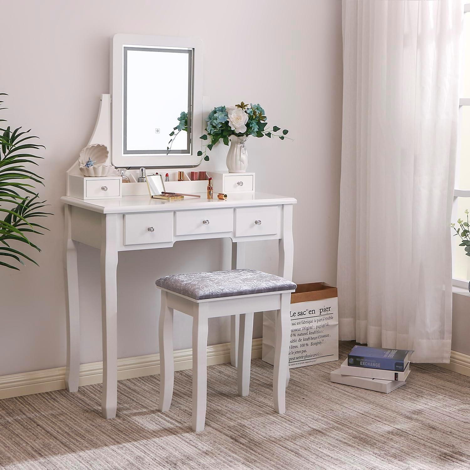 BEWISHOME Vanity Set with Mirror & Cushioned Stool Dressing Table Vanity Makeup Table 5 Drawers 2 Dividers Movable Organizers White FST01W(10 bulbs)