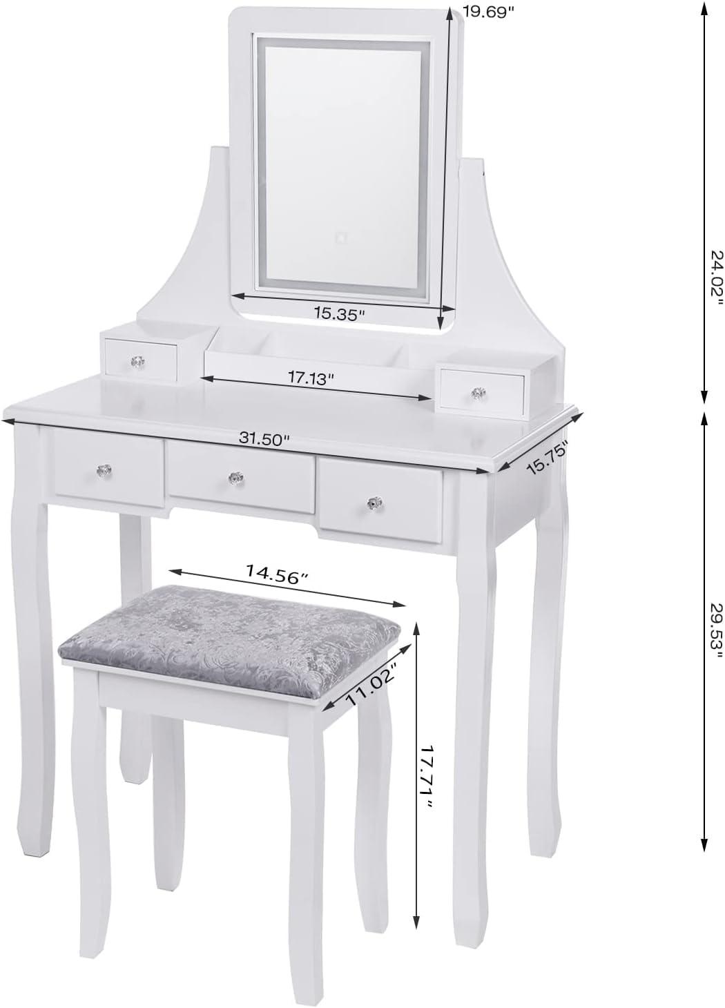 EASY ASSEMBLY: Some simple assembly is required by attaching the legs to the stool and table, as well as assembling the mirror and attaching that. All parts and instructions are included in this vanity makeup table set. Size:31.5″L x 15.8″W x 53.5″H (80 x 40 x 136cm)