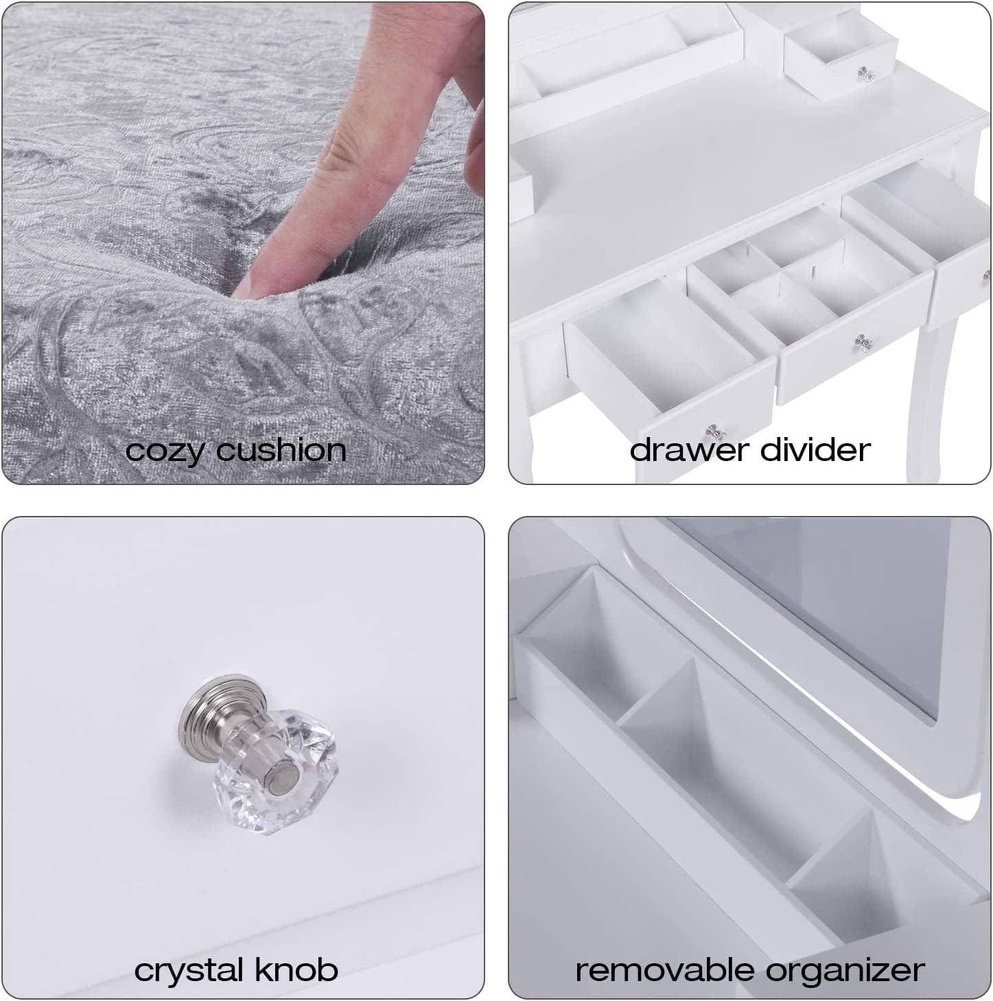 imageBEWISHOME Vanity Set with Mirror ampamp Cushioned Stool Dressing Table Vanity Makeup Table 5 Drawers 2 Dividers Movable Organizers White FST01W10 bulbs