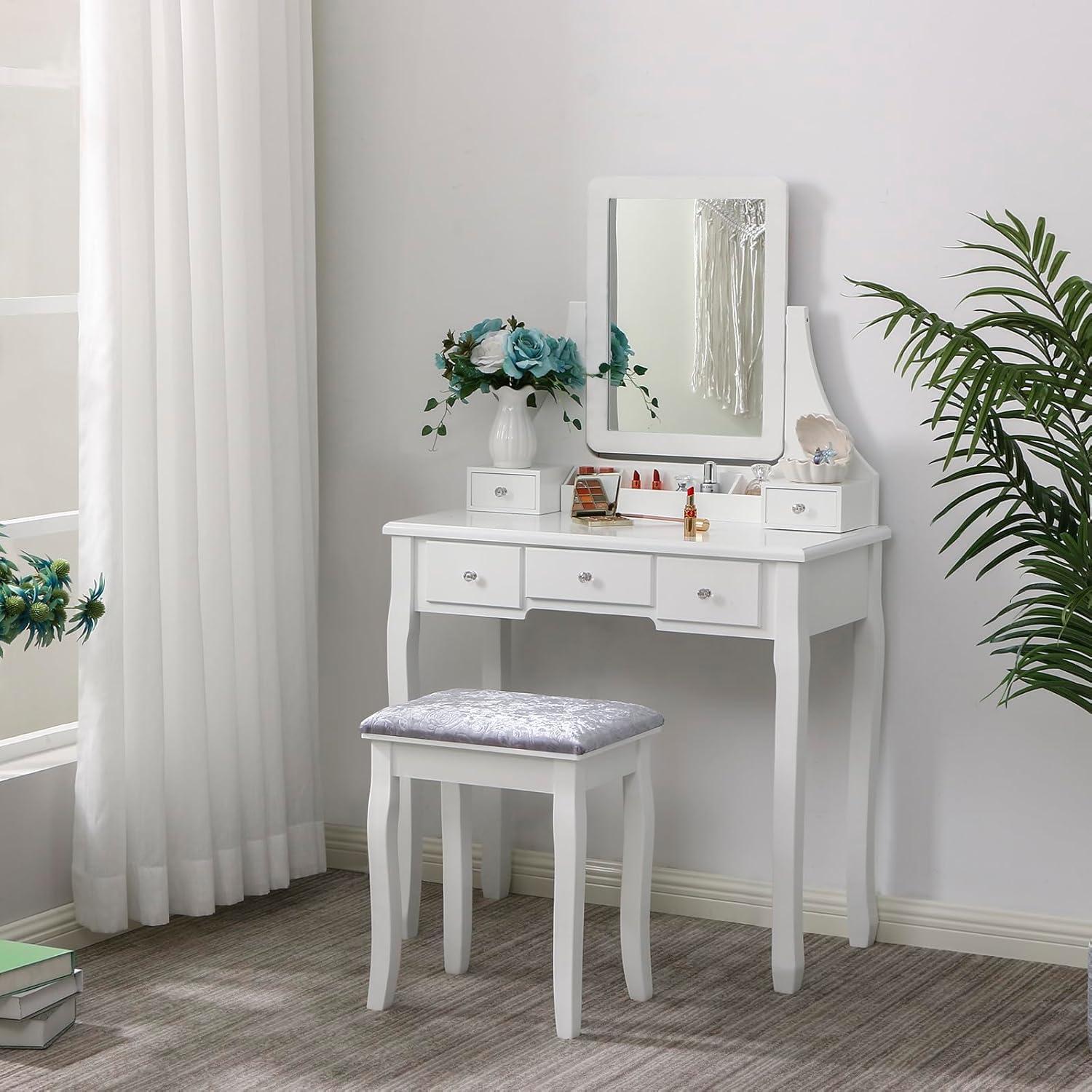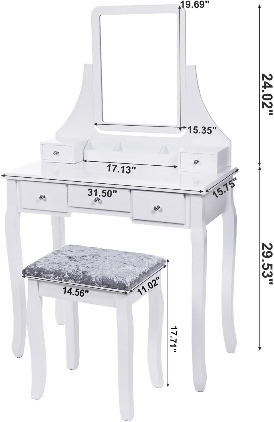 ELEGANT AND FUNCTIONAL DESIGN: Simple and elegant design with 360°pivoting mirror, crystal knob and wooden legs, this vanity table and stool set can be a functional and sturdy piece of furniture to your bedroom, bathroom, closet or hallway. Cushioned seat offer you a comfy place to do your makeup and hair. This makeup desk will be an ideal gift option for your girl on Valentine's Day, Mother's Day