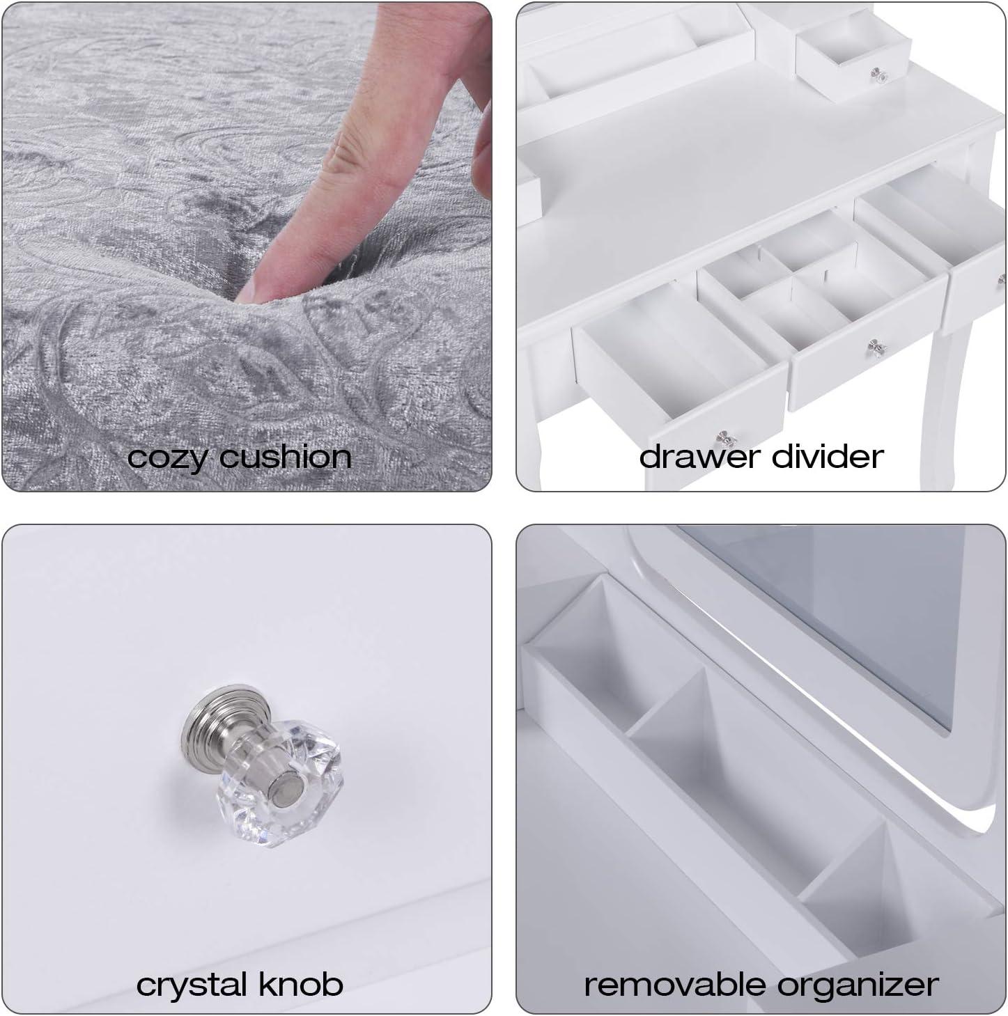 BEWISHOME Vanity Set with Mirror & Cushioned Stool Dressing Table Vanity Makeup Table 5 Drawers 2 Dividers Movable Organizers White FST01W(10 bulbs)