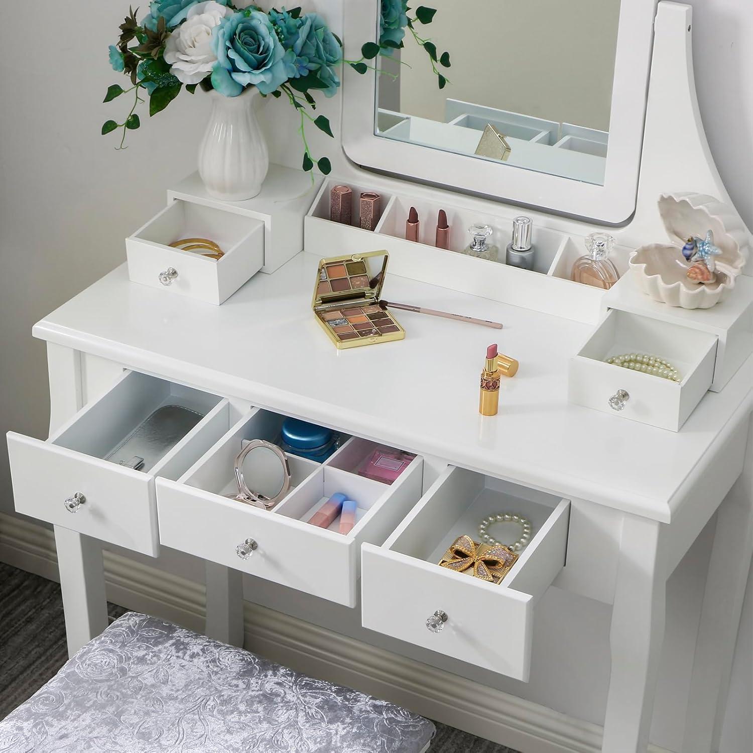 BEWISHOME Vanity Set with Mirror & Cushioned Stool Dressing Table Vanity Makeup Table 5 Drawers 2 Dividers Movable Organizers White FST01W(without light)