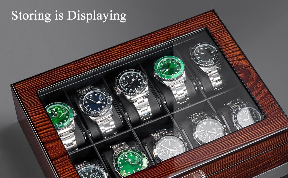 [Clear Glass Lid]: This watch display case crafted with a sleek transparent glass top, the watch box allows you to effortlessly view and select the ideal watch for any occasion. The watch case clear lid also enables solar-powered watches to charge naturally by daylight, save your time and bring you convenience