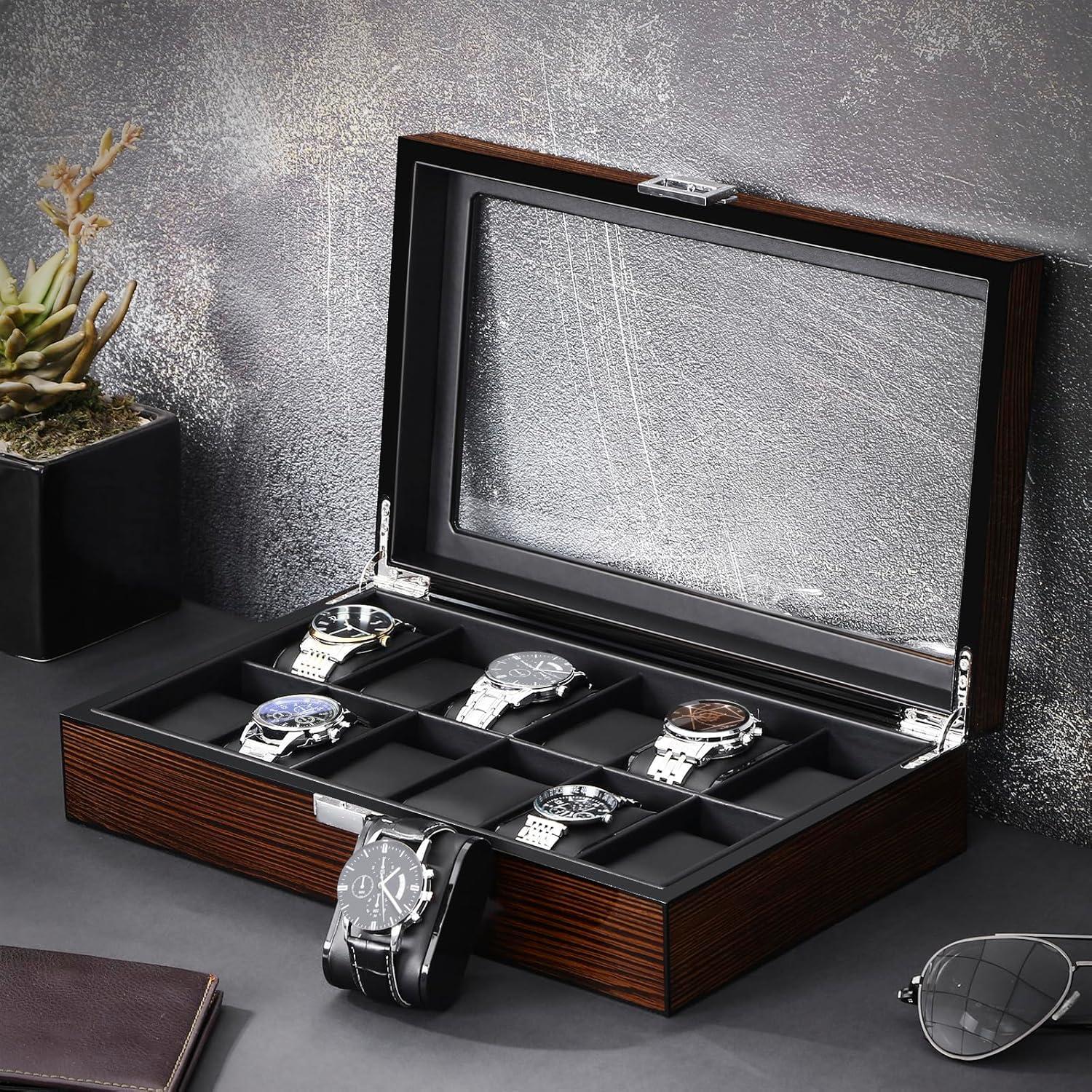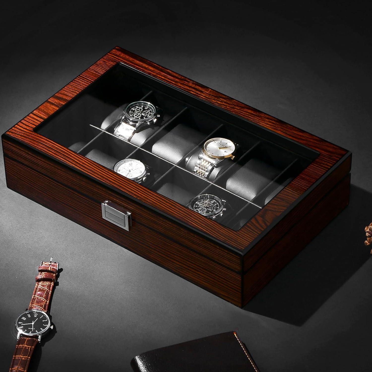 BEWISHOME Watch Case, 12-Slot Watch Box with Large Glass Lid, Wooden Watch Box Organizer for Men, Watch Storage with Removable Watch Pillows, Synthetic Leather Interior, Brown SSH12Y(10 Solts)