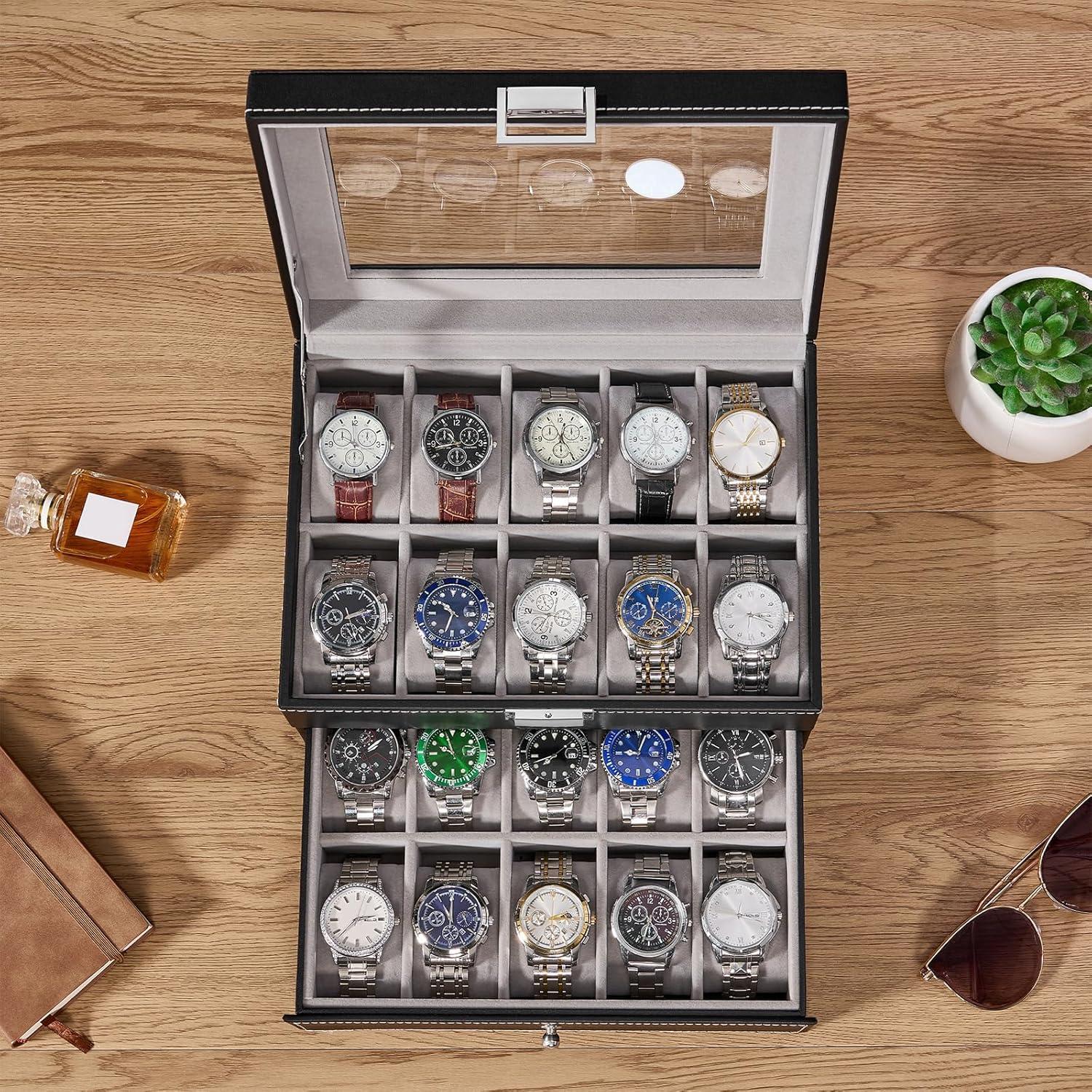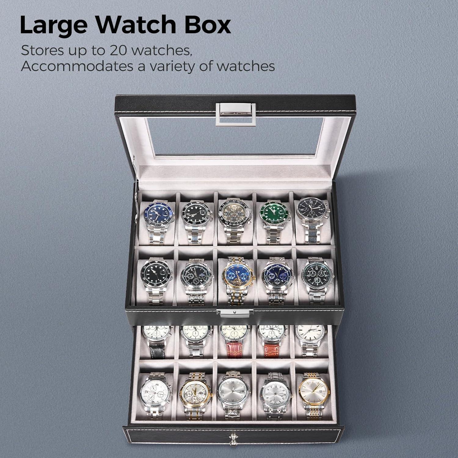 BEWISHOME Watch Case, 20-Slot Watch Box Organizer for Men Watch Case with Large Glass Lid Watch Travel Case Removable Watch Pillows, Mens Jewelry Box Watch Display Case, Watch Storage, Black SSH04C(Black+Gray)