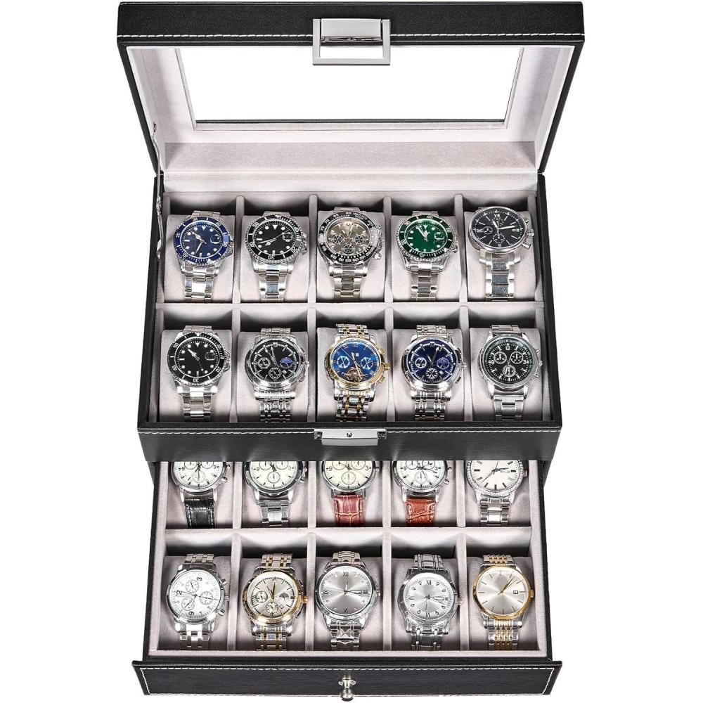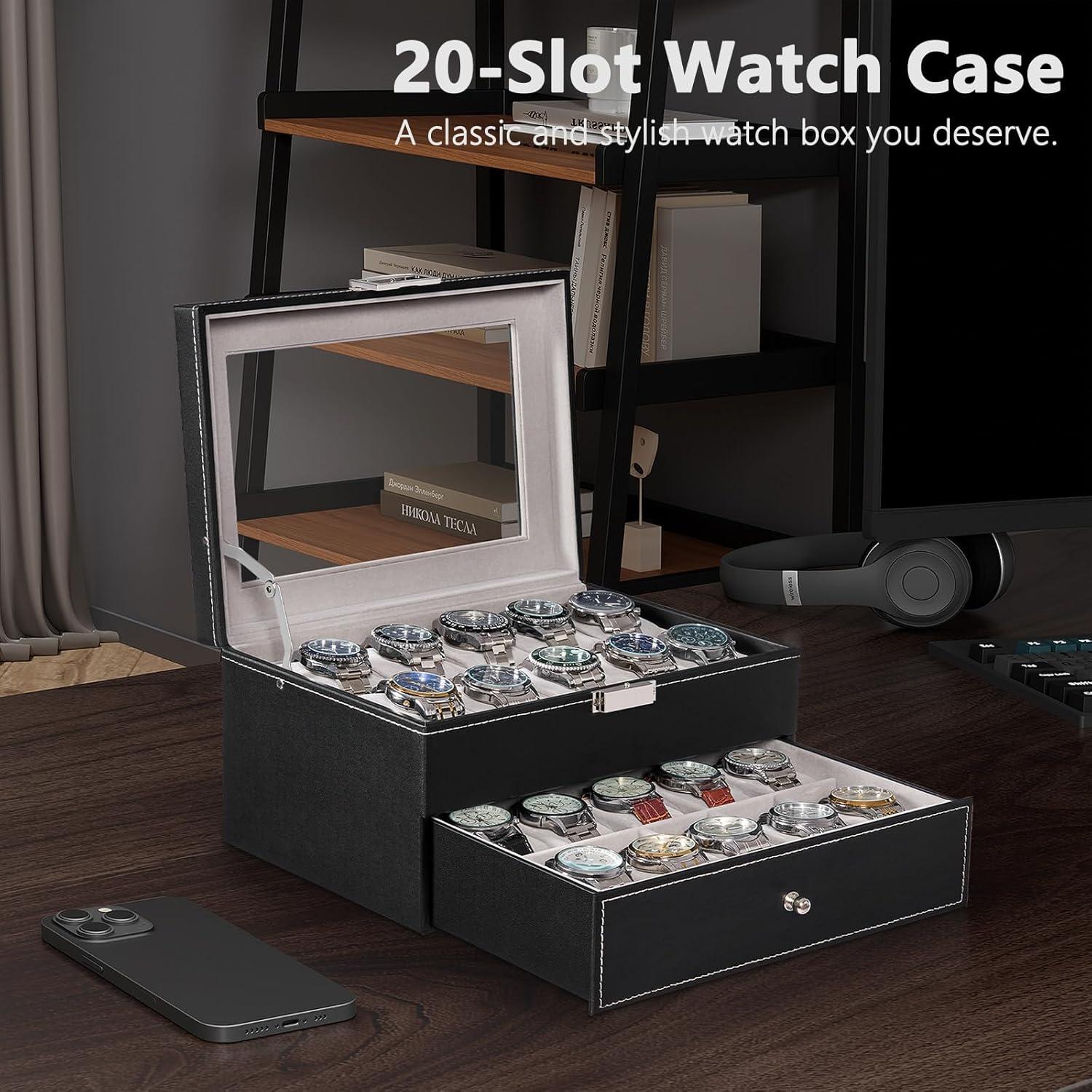 【What You'll Receive】A classic watch storage box with 20 watch storage slots and a glass lid, effectively preventing dust from settling on your watches.