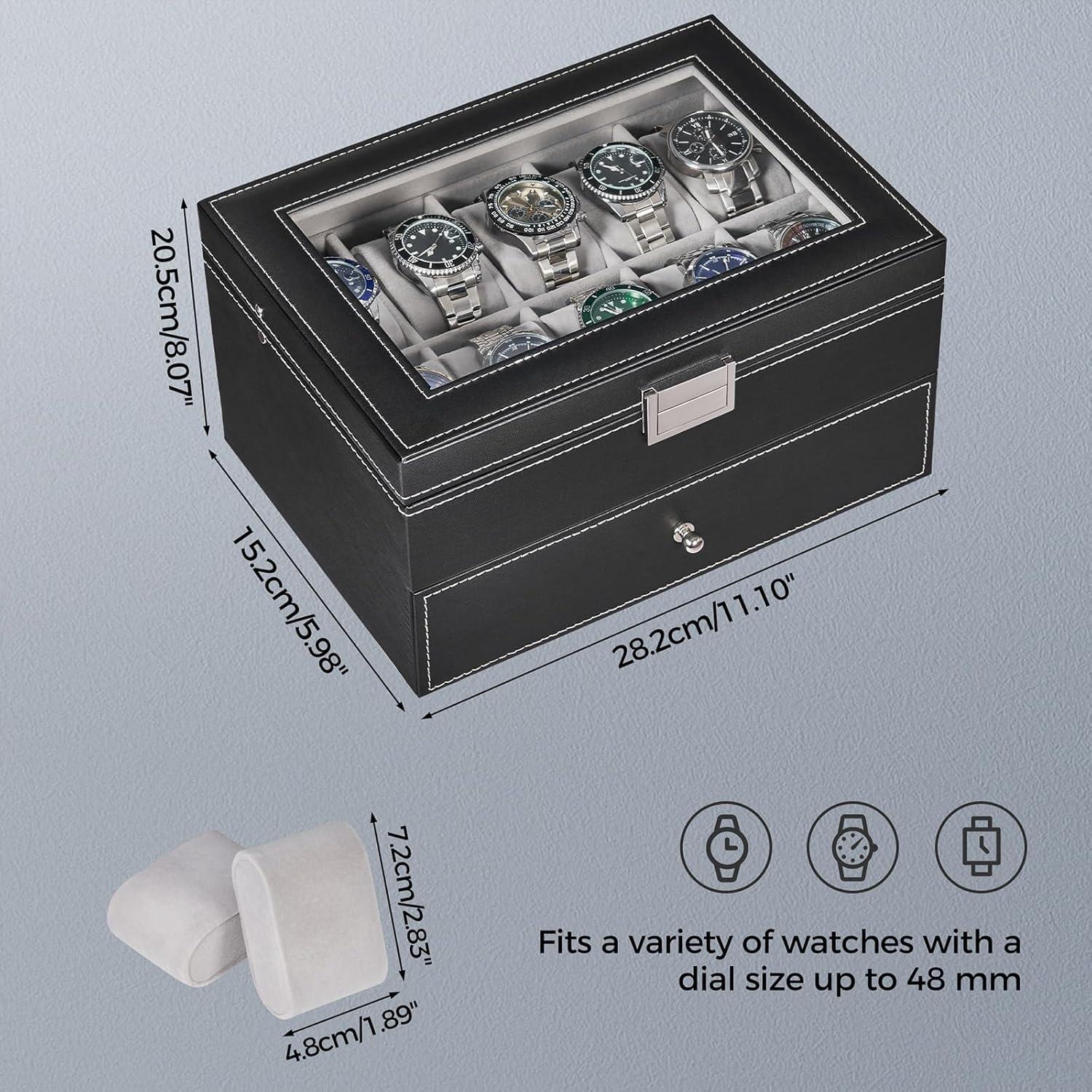 【Perfect Size】: The black Watch box dimensions: 11.3 × 8 × 5.9 in (width × depth × height), with a dial size of up to 48 millimeters. This watch box is equipped with 20 watch display compartments. It safely stores all watches, organizes your watch collection, and eliminates clutter. Quickly find the perfect watch for any occasion.