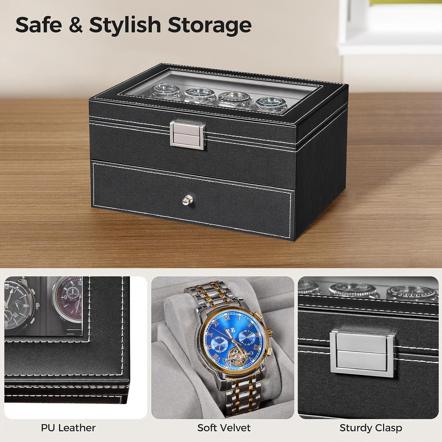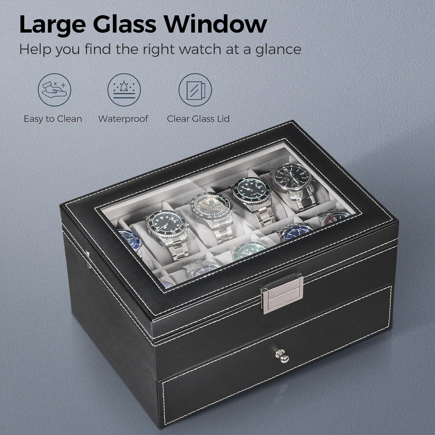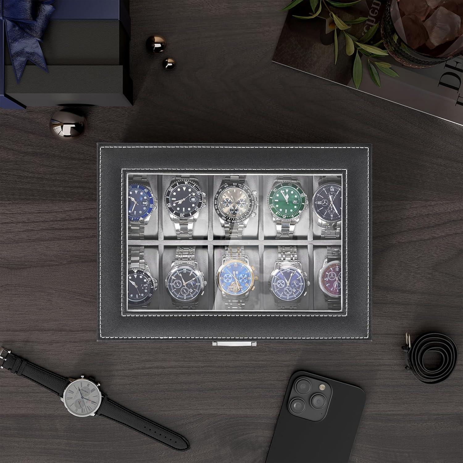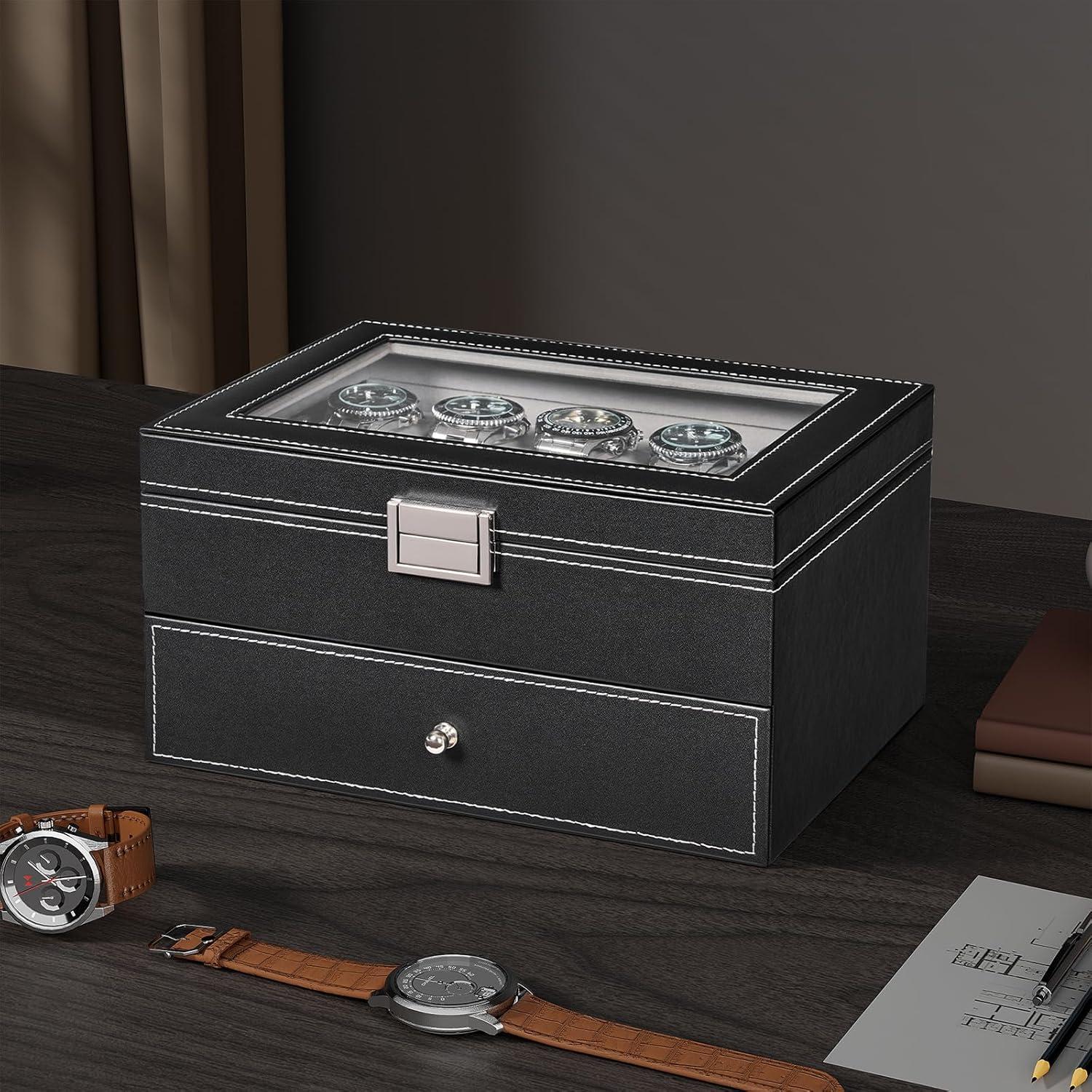【Transparent Glass Lid】This black watch cases for men features a transparent glass lid design, allowing you to view all watches and quickly find the one you need. Additionally, this watch box is easy to clean and can be wiped with a cloth or paper towel.
