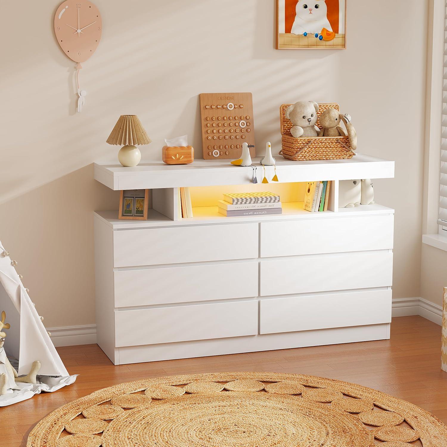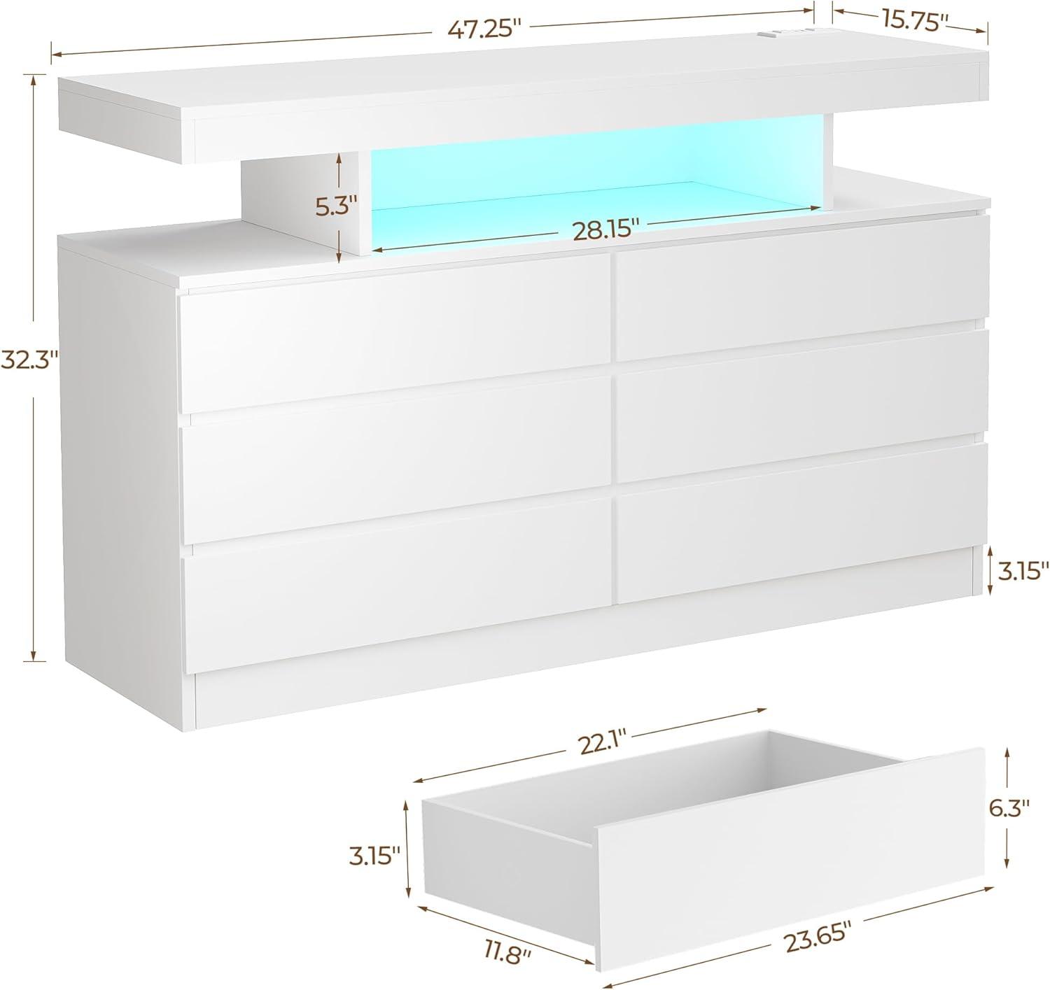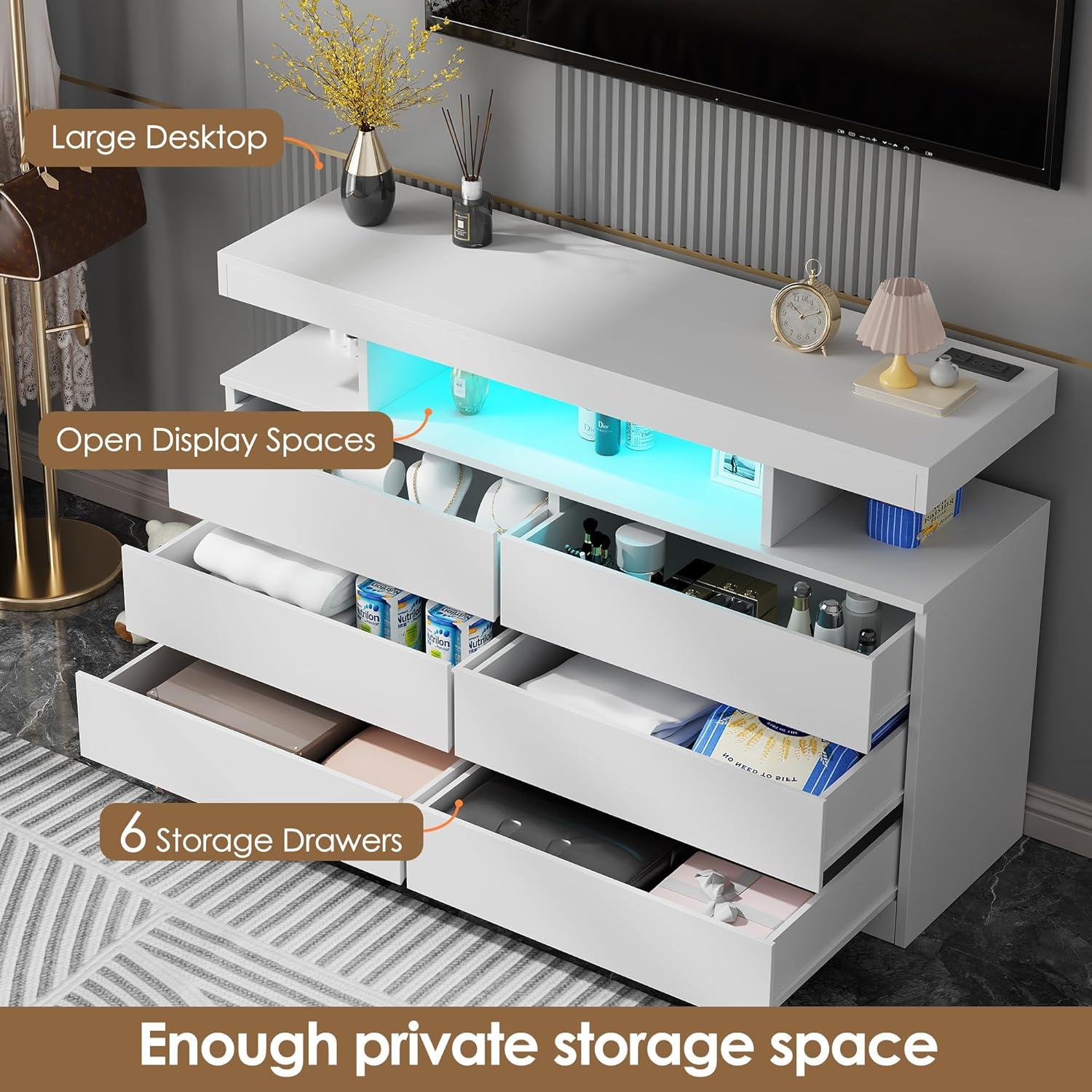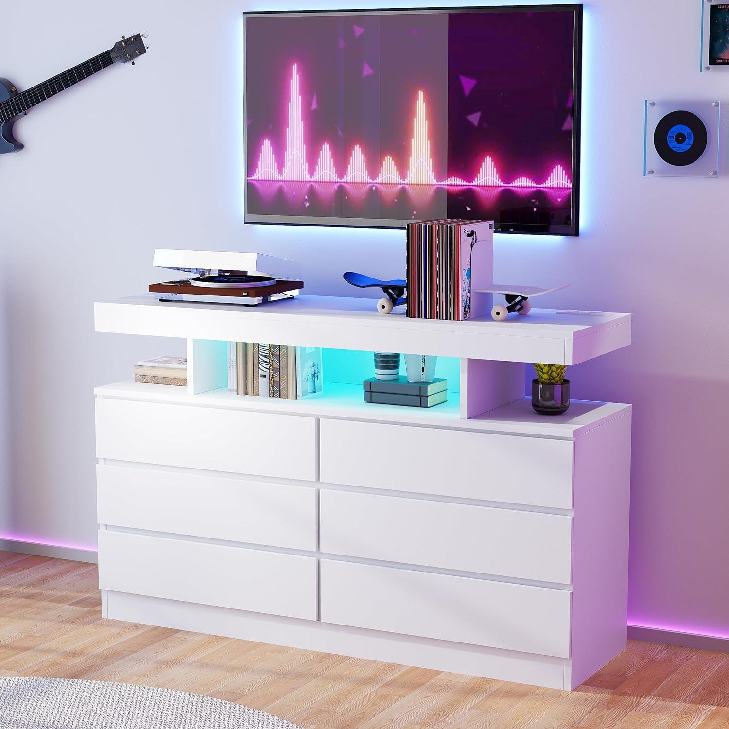 BEWISHOME White Dresser for Bedroom with Charging Station and LED Lights, Wood 6 Drawer Dresser TV Stand with Open Space, Modern Wide Dressers Chest of Drawers for Closet, Living Room, White KCG02W(White)