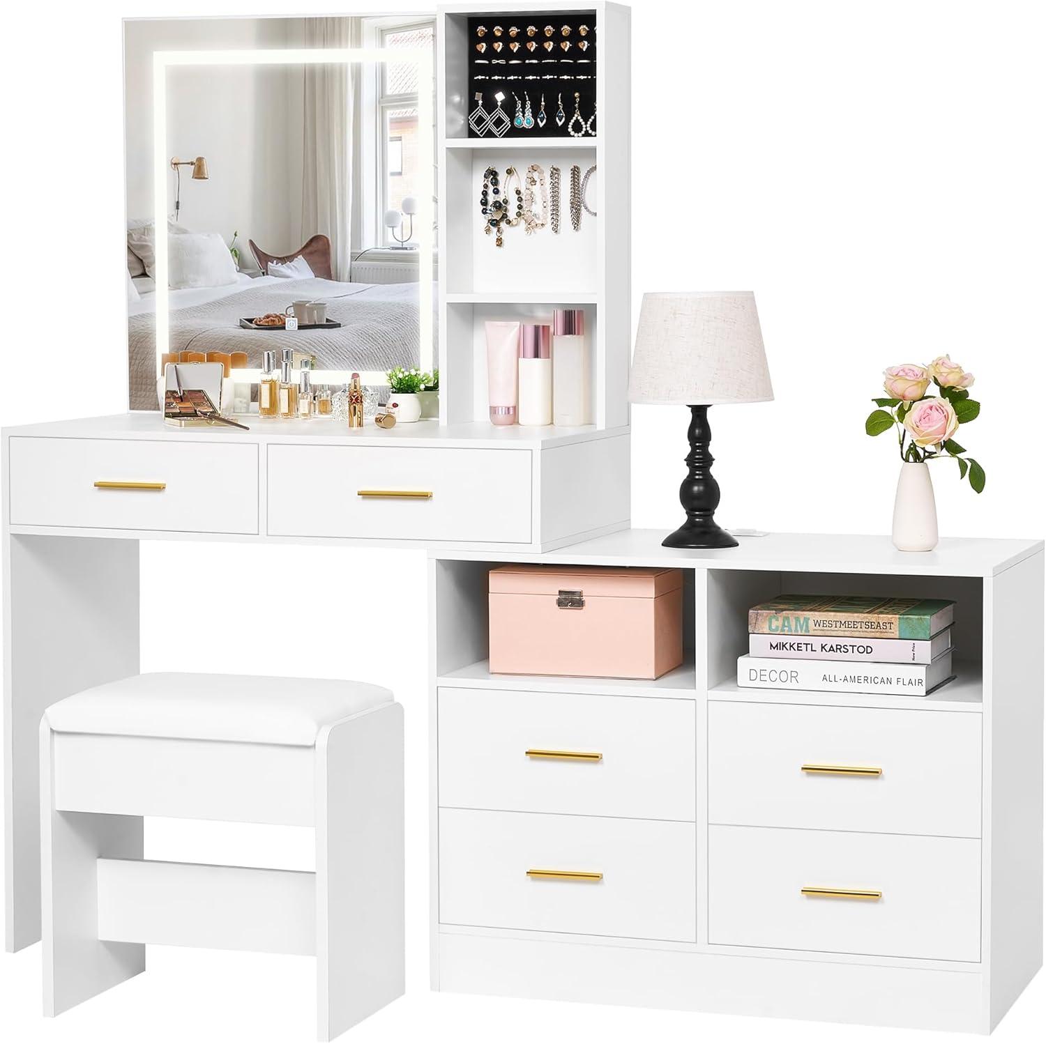 BEWISHOME White Vanity Desk with Mirror and Lights,Makeup Vanity L Shape Change Makeup Desk with 6 Drawers Stool Power Outlet Jewelry Storage,Dressing Table with Dresser for Bedroom Girls Women FST26W