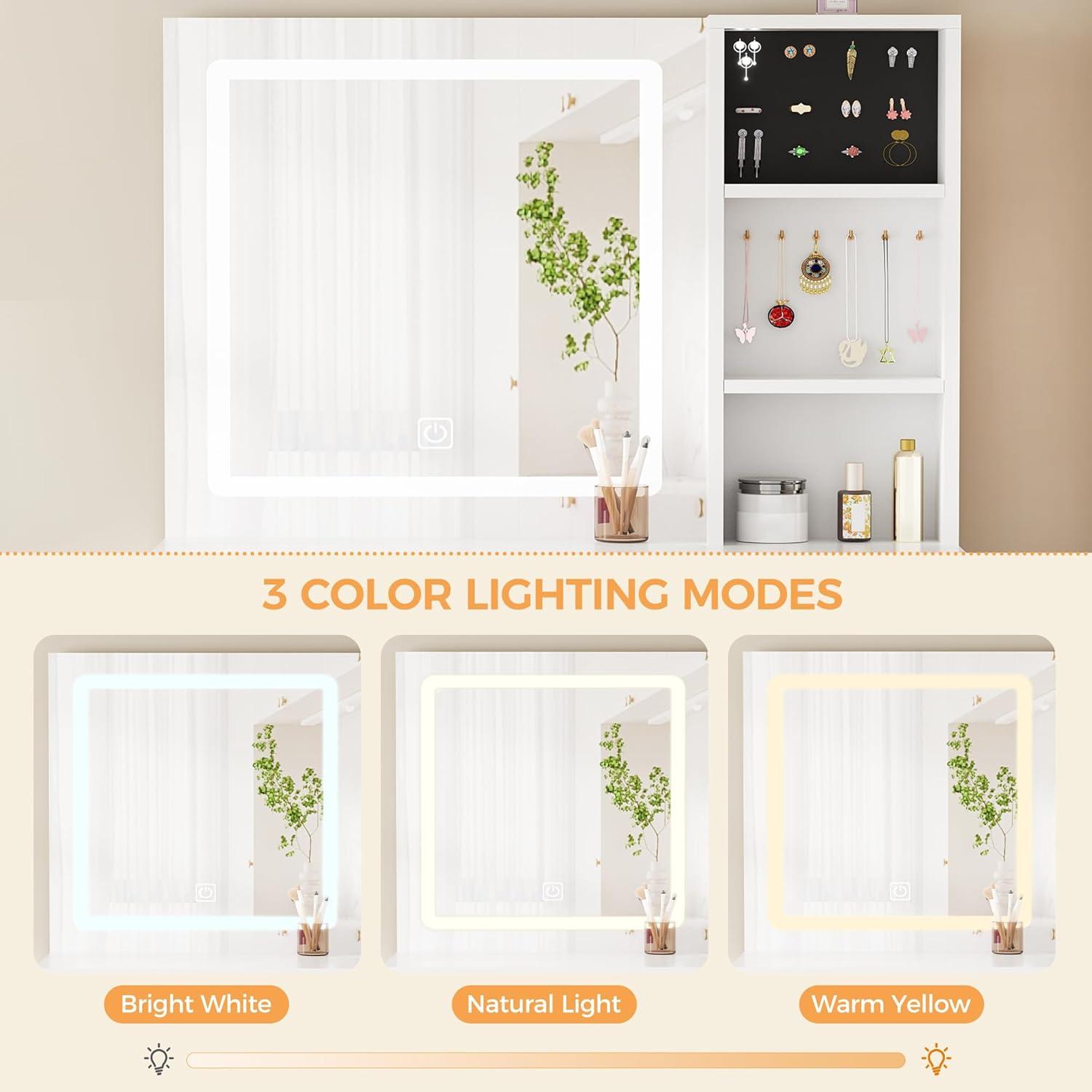 HD LARGE LED MIRROR: This white makeup vanity table is equipped with a lighted mirror that offers 3 color modes: warm light, natural light, and cool light. It features adjustable brightness to meet your lighting needs for daily makeup application. Discover your ideal glow and effortlessly enjoy a modern, smart lifestyle