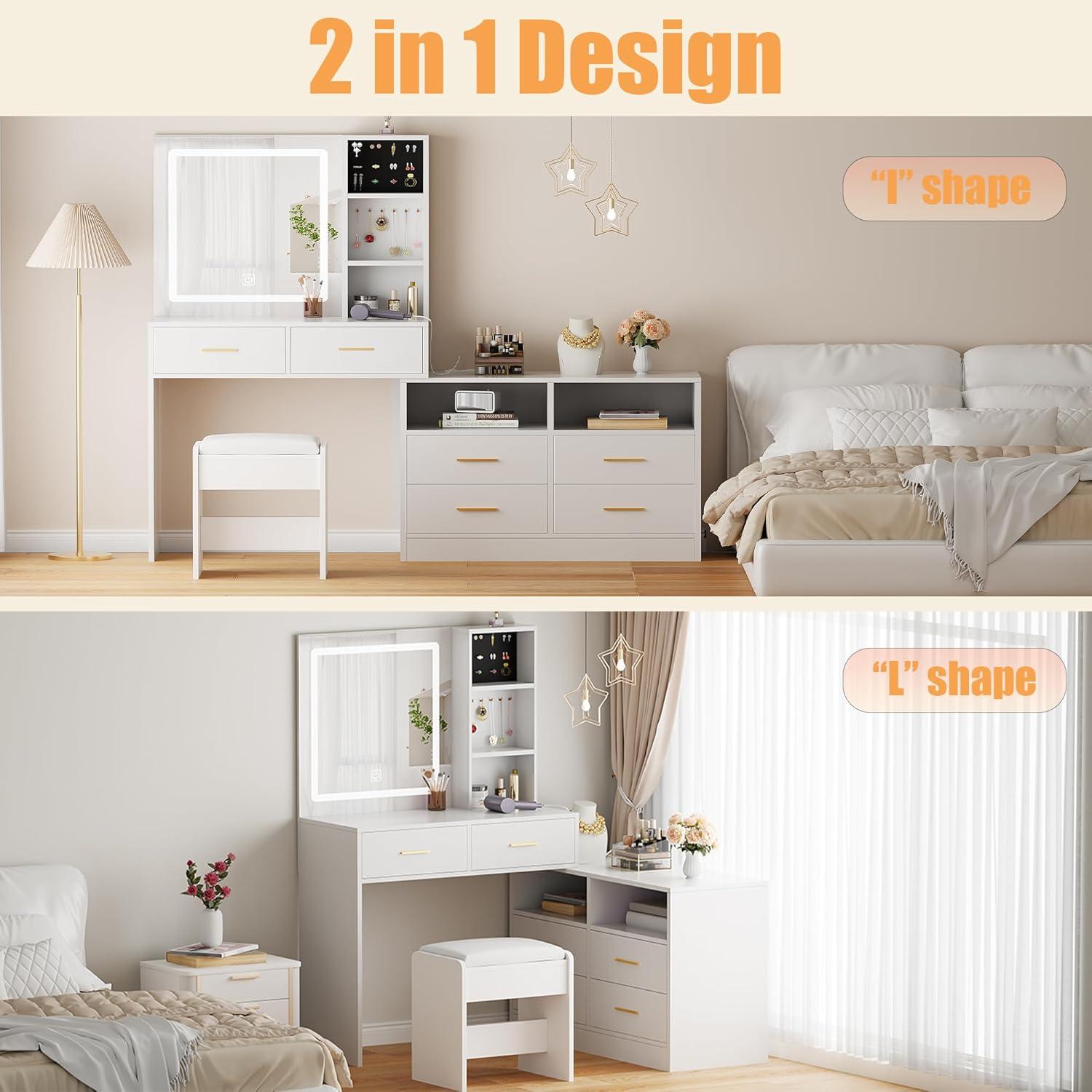 2 -IN -1 DESIGN: This vanity can be easily transformed into an L-shape to maximize space and functionality in your bedroom. It can also be converted into an I-shape. The versatility of vanity makes it be a practical and stylish addition to any room. Whether you need extra storage or simply want to optimize your space, this innovative design is worth considering
